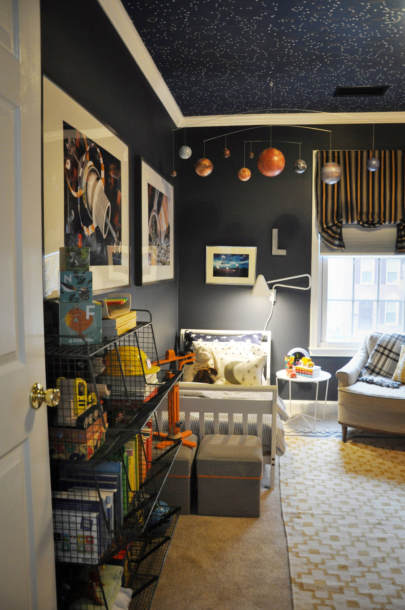 Auch wenn Pluto streng genommen nicht mehr zu den Planeten unseres Sonnensystems gehört – mit diesem Mobile, der Bettwäsche mit Sternchenmotiv und von dunkelgrauen Wänden und einem beeindruckenden Sternenhimmel eingehüllt, sind kleine Himmelsstürmer hier ganz in ihrem Element.