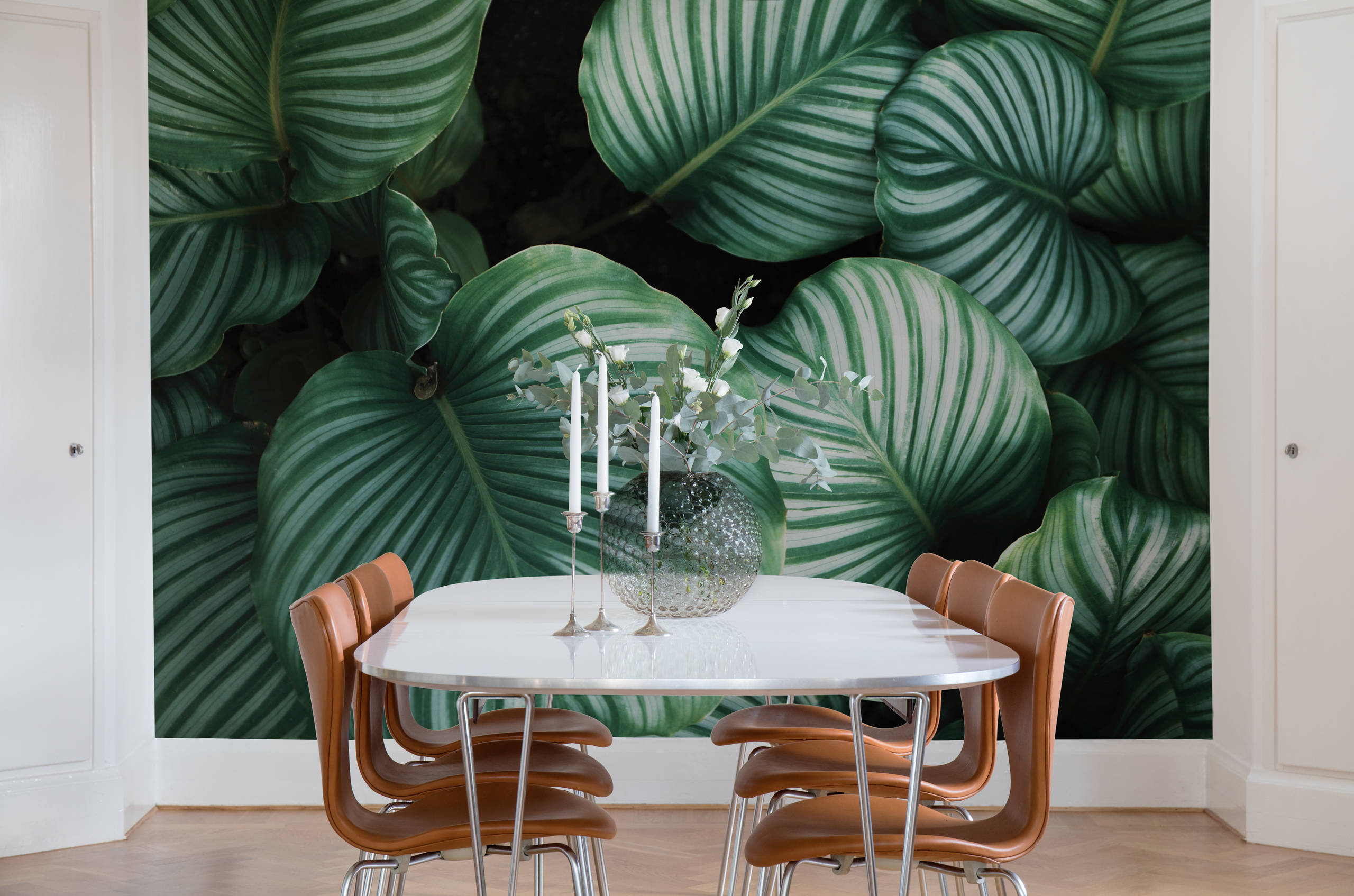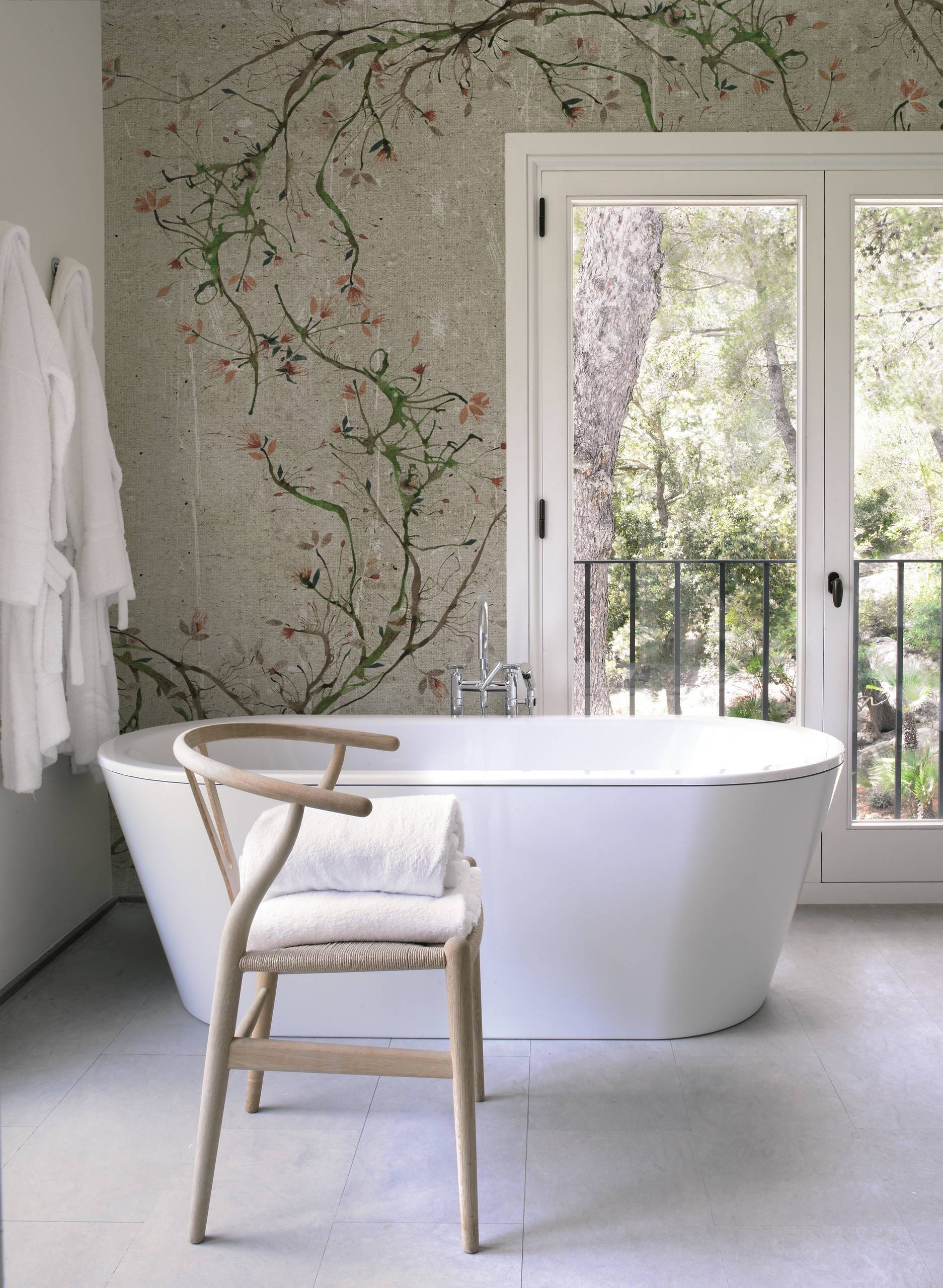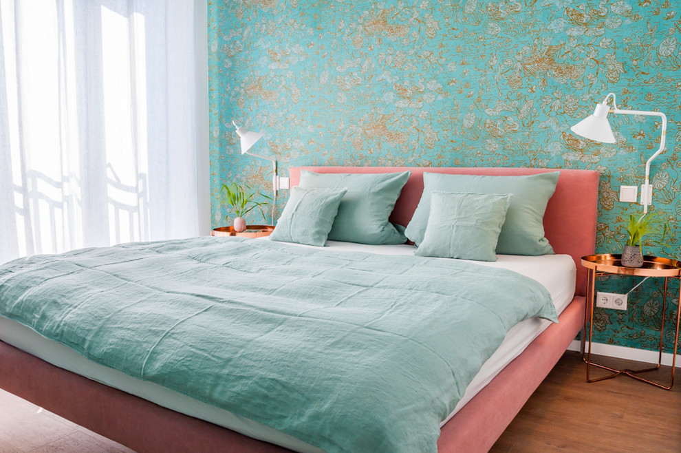 Pflanzenmotive, oft mit historischen Anklängen – der schwedische Hersteller Sandberg schafft es wie kein anderer, florale Motive und Muster fernab einer altbackenen Blümchentapeten-Ästhetik zu entwickeln. In dieser Ferienwohnung schmückt die Tapete „Raphael“ das Schlafzimmer mit einem Blätterdach.