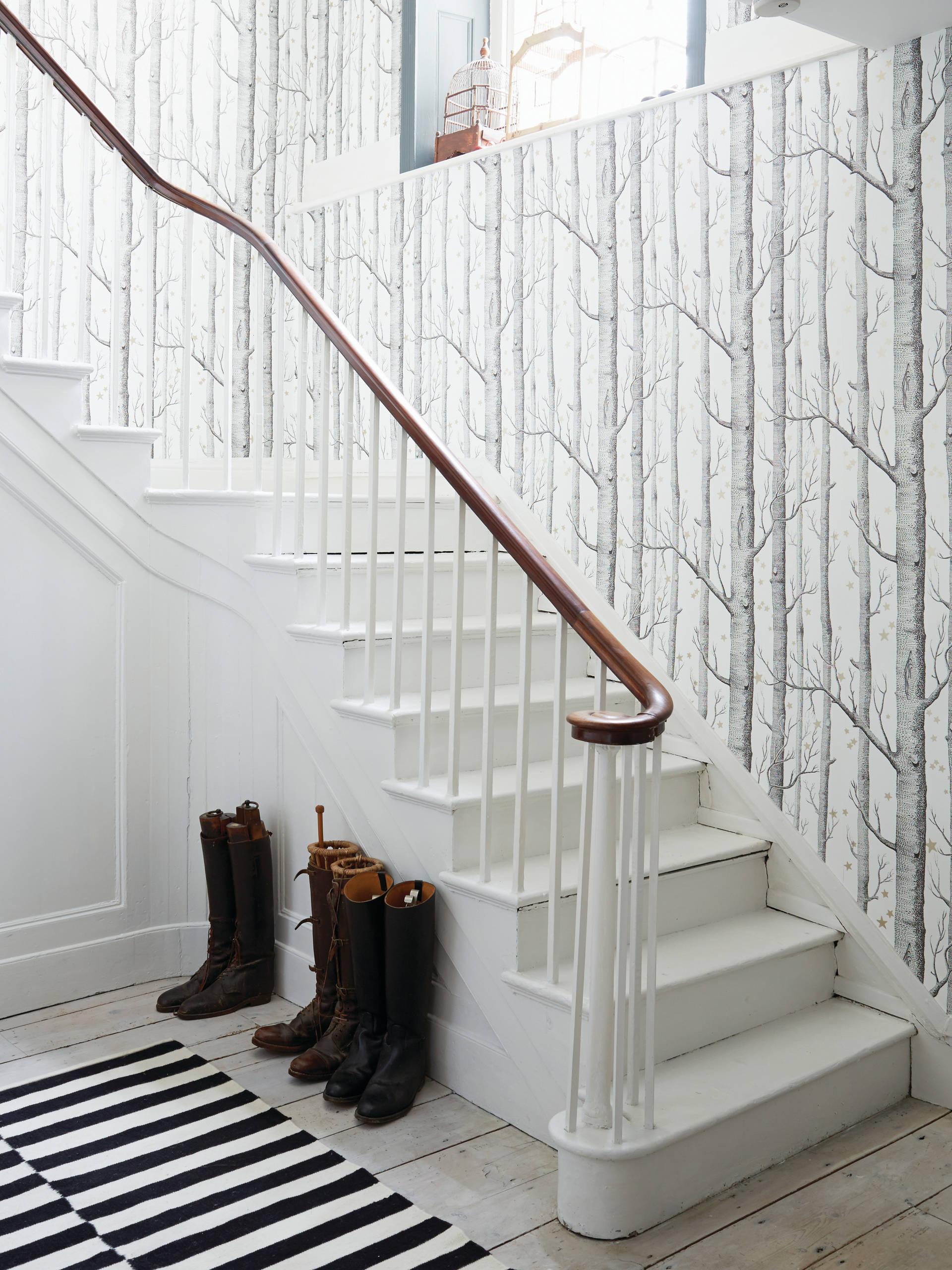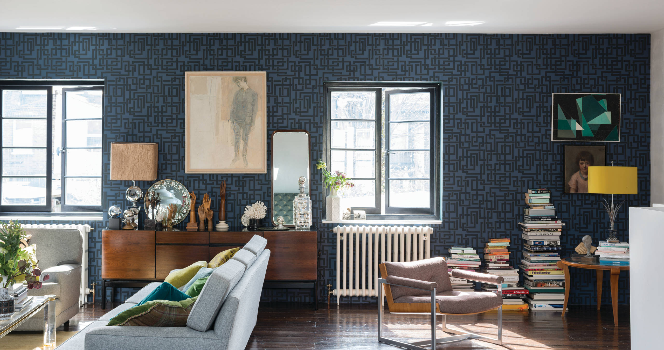 1873 in Londons Norden gegründet, gehört der britische Traditionshersteller Cole & Son zu den Urgesteinen unter den Tapetenherstellern, und sein Wandschmuck hat es sogar bis in den Buckingham Palace geschafft. Die Dessins der Tapeten, die auch heute noch im klassischen Druckverfahren in Großbritannien hergestellt werden, entstehen häufig aus der Zusammenarbeit mit berühmten Künstlern und Designern – wie zum Beispiel „Woods“ von Michael Clarke (im Bild), „Aquario“ von Piero Fornasetti oder „Hicks Hexagon“ von David Hicks (unten im Bild).