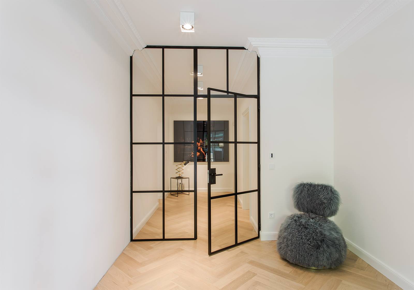 6. Elegante Linien. Türen und Raumtrenner aus Schwarzstahl und Glas sind im Trend – und passen nicht nur zum Industrial Style, wie Arzu Kartal Interior Design in diesem Altbau-Flur zeigt. Elegant unterteilt die Tür im Industriefenster-Look den Flur, ohne dass dieser Helligkeit einbüßt.