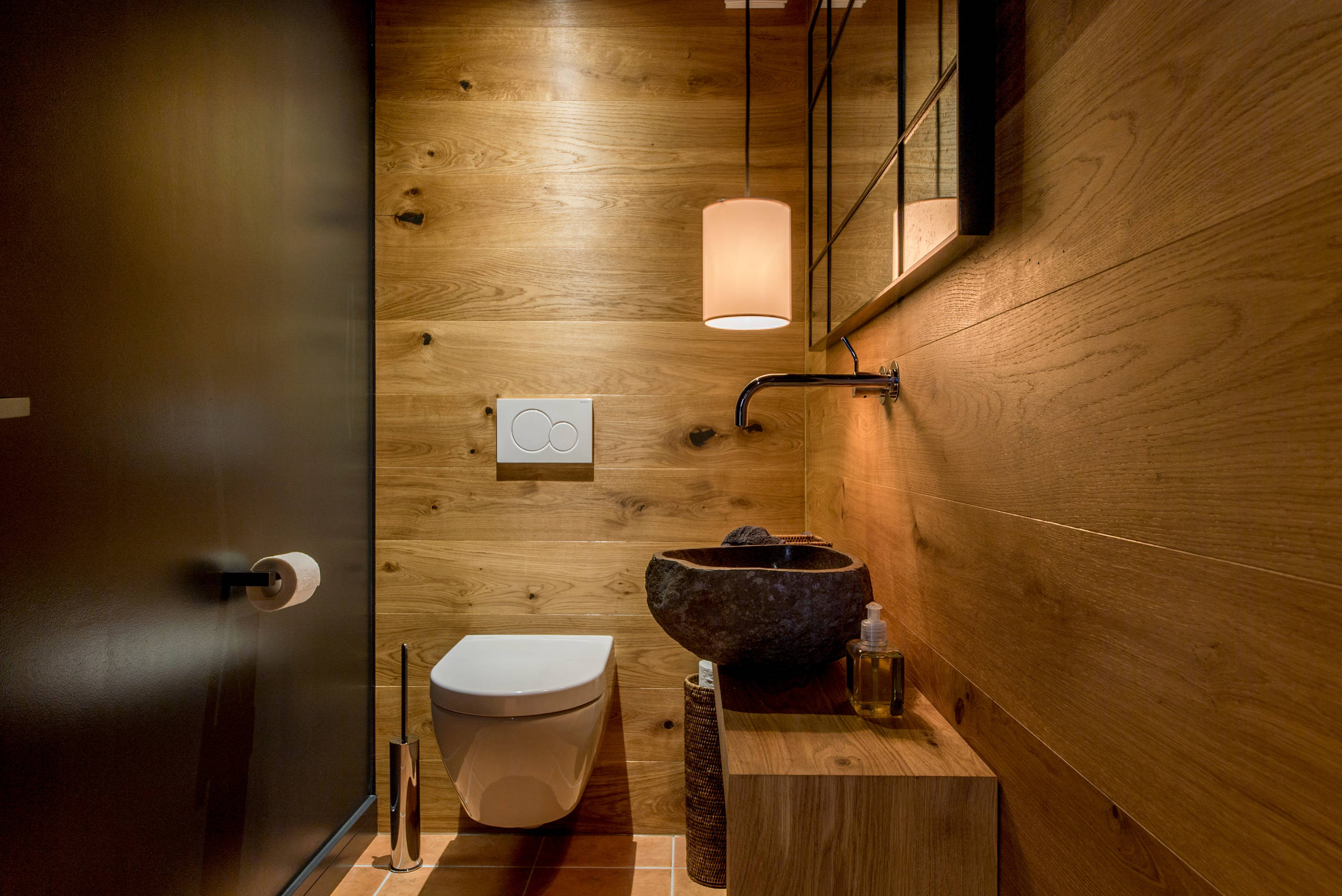 8. Holz statt Fliesen. Mit Eichenholzwänden und einem besonderen Waschbecken verwandelten Ohlde & Scholz ein innenliegendes Gäste-WC in ein sinnliches Örtchen. Es müssen ja nicht immer die ewig gleichen, weißen Fliesen für Wände sein.