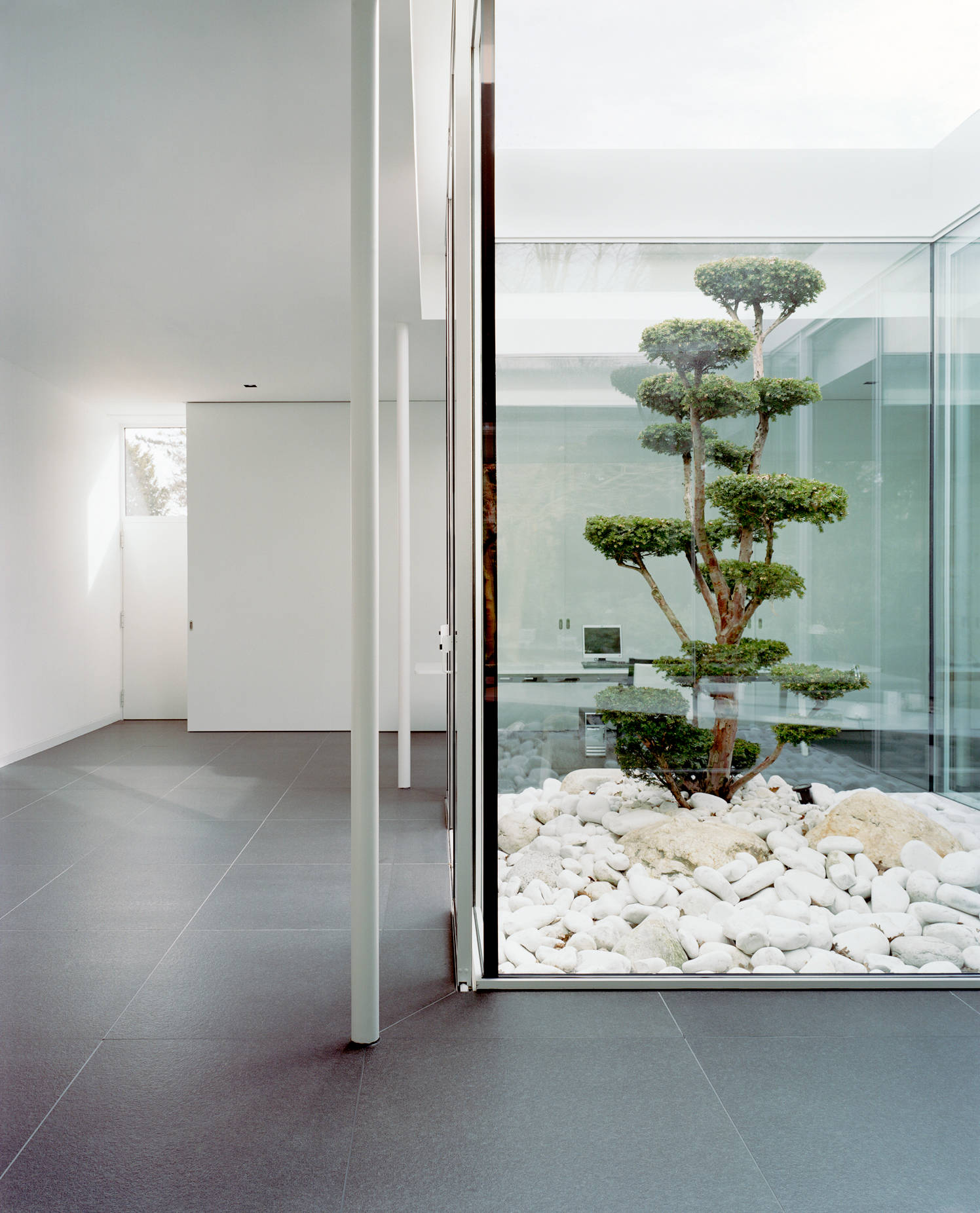 Ein Großbonsai ist der Star dieses Atriums einer Kölner Villa aus den 50er-Jahren. Ein gutes Beispiel, wie Glaswände für ein spannendes Wechselspiel zwischen Innen und Außen sorgen können.