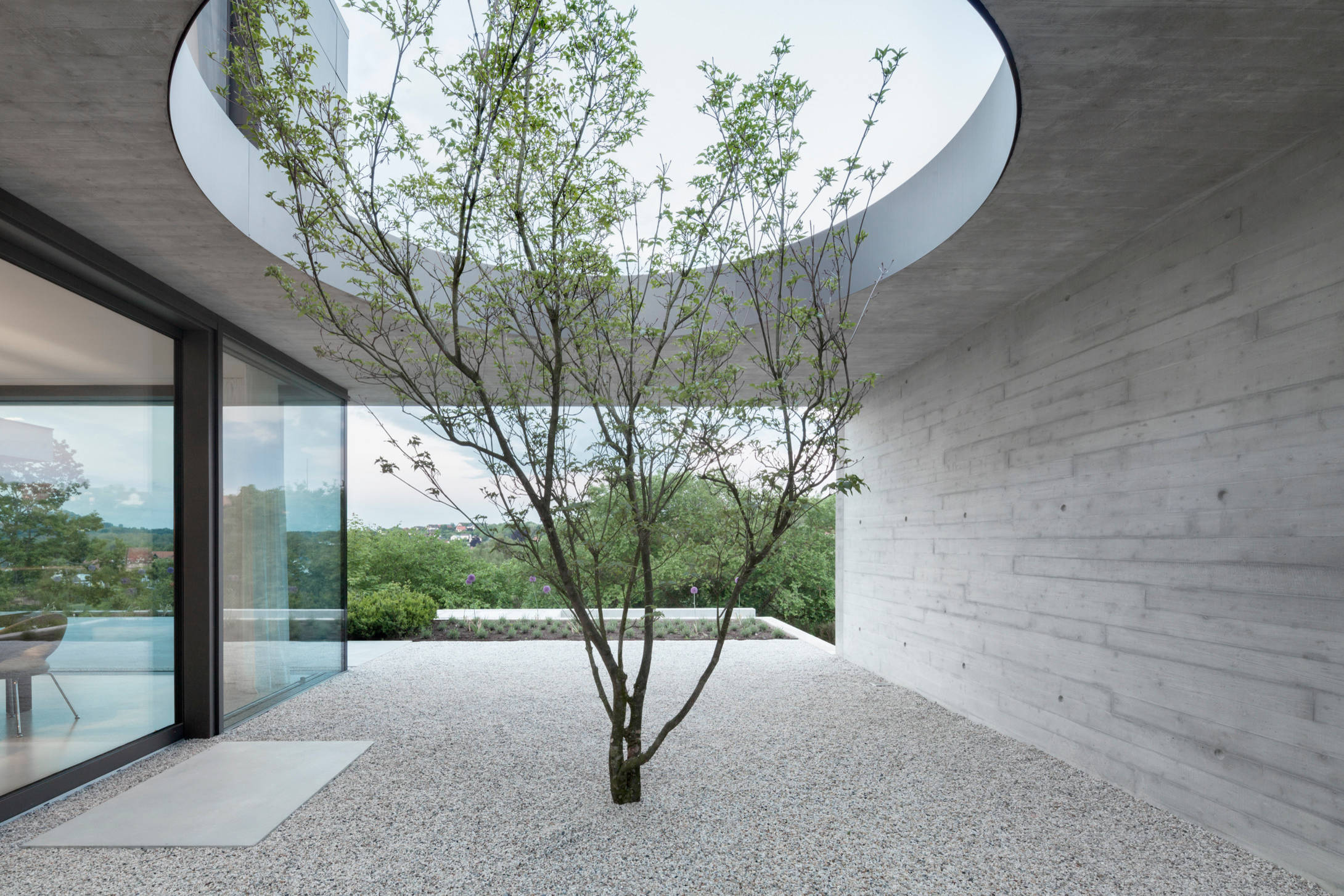 Ein kreisrundes Loch in der Betondecke macht dieses für zwei Personen konzipierte Einfamilienhaus in Köln zu einem spektakulären Bauwerk. Dieses Atrium ist zwar nicht zu allen vier Seiten geschlossen, hat aber eine spektakuläre Aussicht zu bieten.