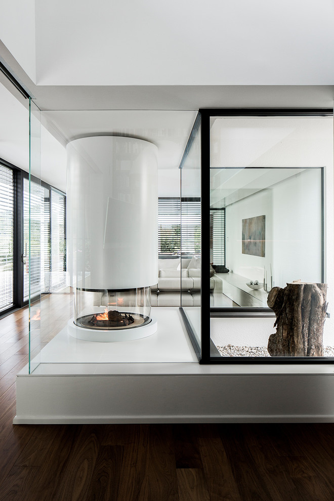 Im Inneren dieses Hauses wetteifern gleich zwei Baukörper um die Aufmerksamkeit des Betrachters. So befindet sich neben dem runden weißen Kamin ein kleiner Lichtschacht, der die ohnehin von Transparenz und Lichtspielen geprägten Villa um eine weitere Tageslichtquelle ergänzt.