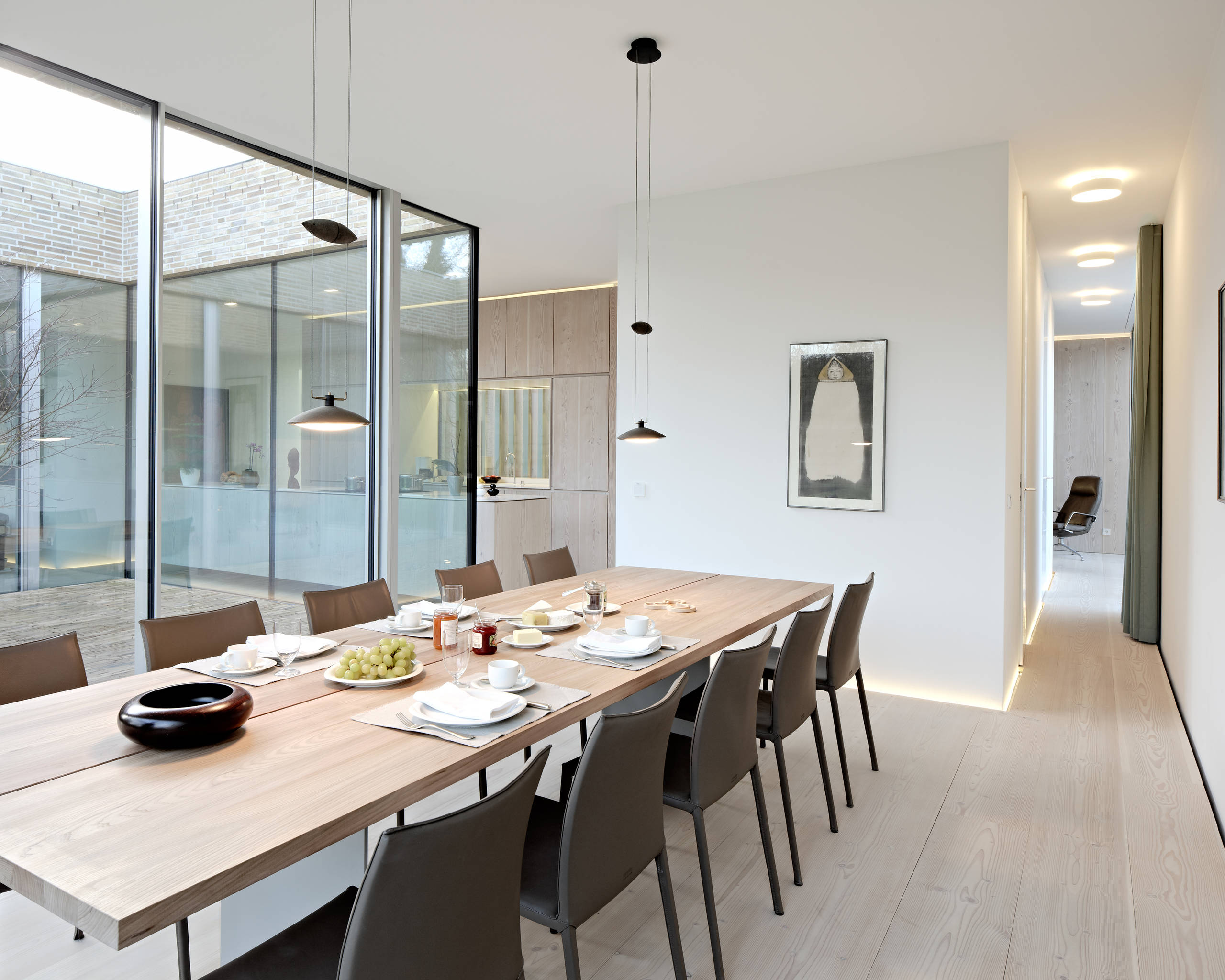 Essbereich, offene Küche, Wohnzimmer – in diesem Hamburger Einfamilienhaus wurden sämtliche Räume um den verglasten Innenhof angeordnet. So entstand ein lichtdurchflutetes Atriumhaus, das mit viel Weiß, hellen Naturtönen und einer minimalistischen Formsprache zen-artige Ruhe ausstrahlt.