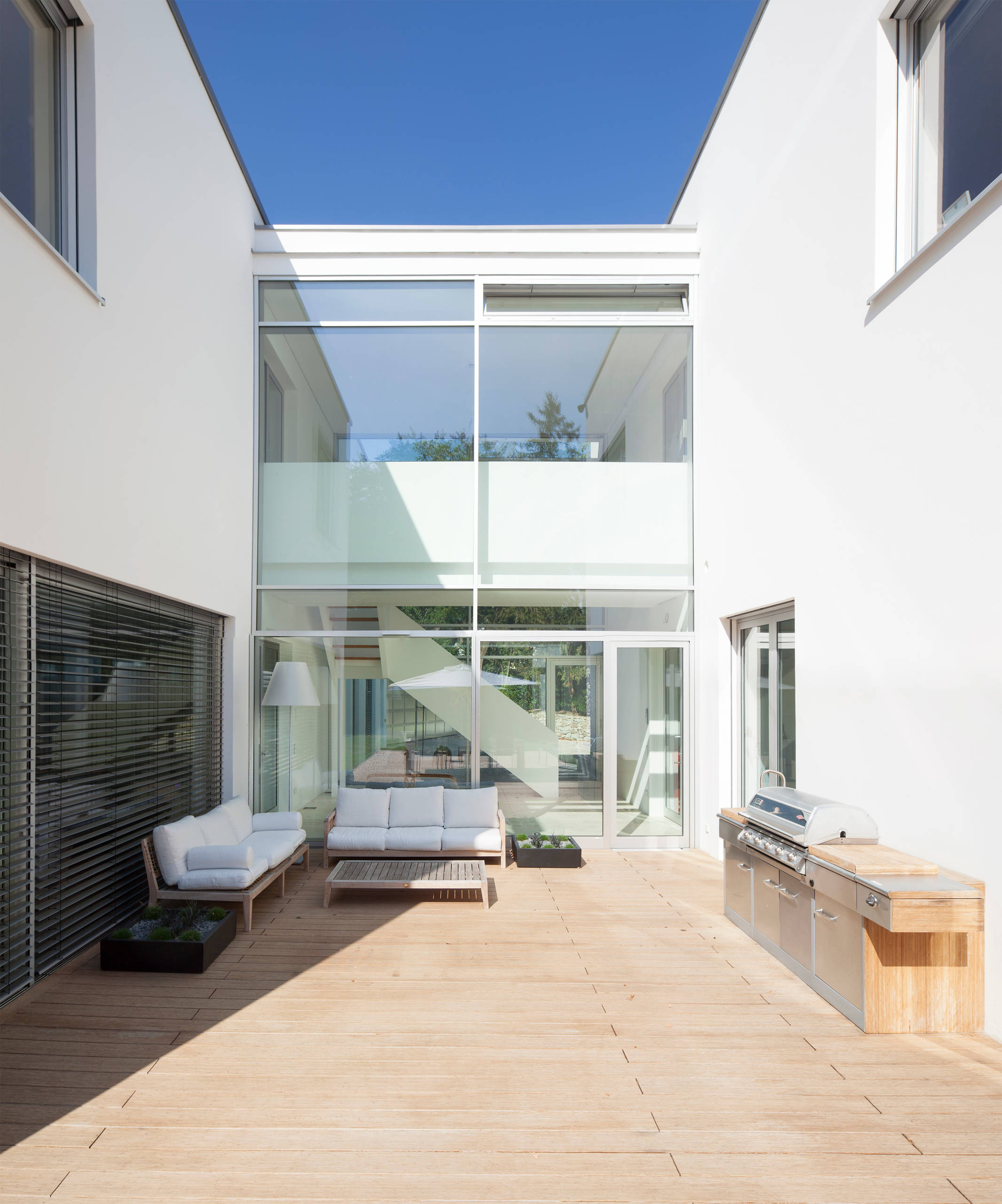 Zwar ist die Terrasse dieses Hauses nur von drei Seiten umschlossen und damit streng genommen kein Atrium. Doch der der wind- und wettergeschützte Raum erfüllt ebenfalls die Funktion eines zentralen, nach oben offenen Treffpunkts.
