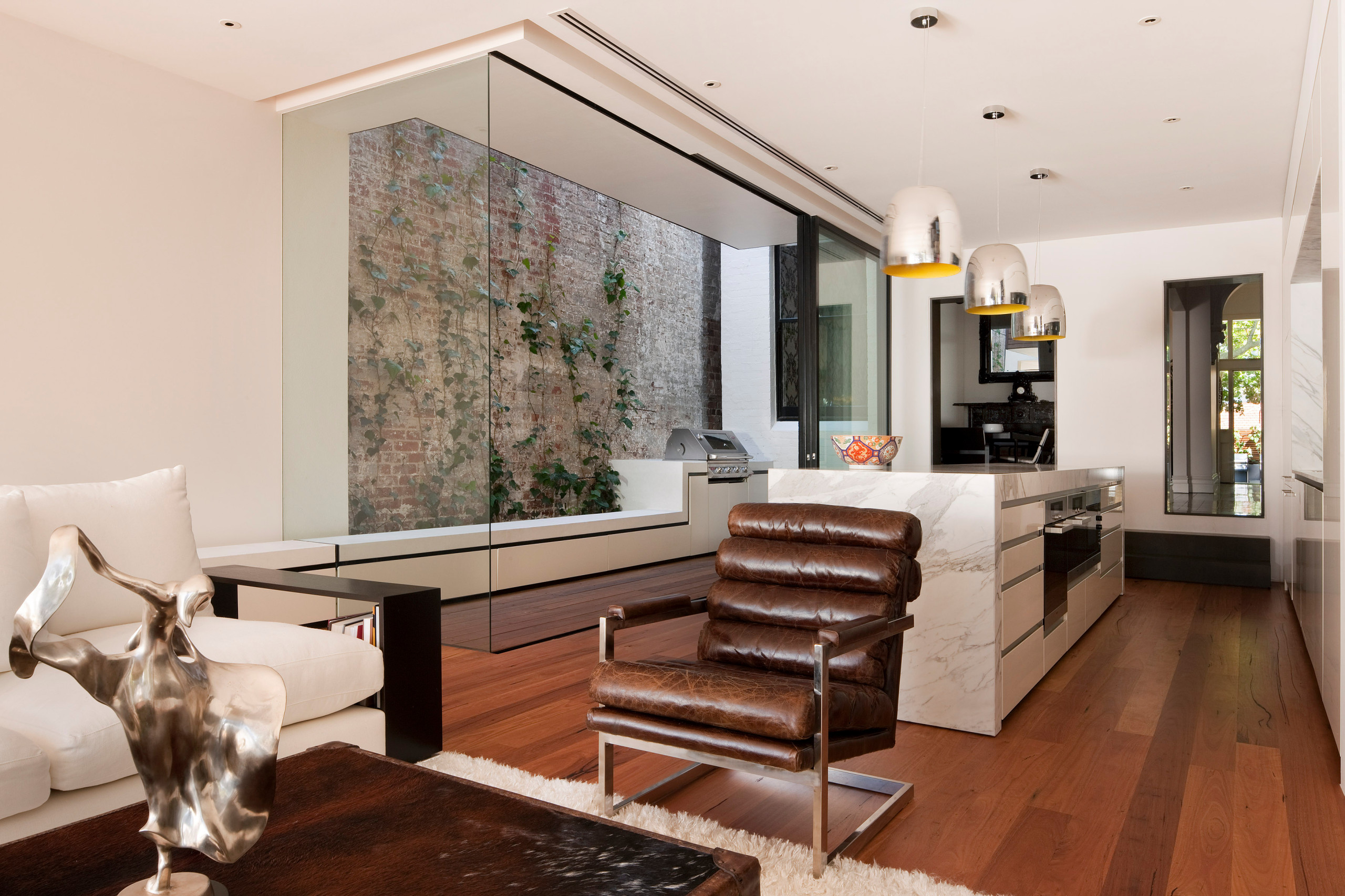 Die Wohnfläche um einen schmalen Streifen verkleinernd, schufen die Bauherren dieses Hauses mit dem Atrium eine großzügige Erweiterung mit Ausblick auf die unverputzte Außenwand des Nachbarhauses. Fußboden und Mobiliar verlaufen durchgängig. So dient das kleine Atrium nicht nur der besseren Versorgung mit Tageslicht, sondern ist auch als Außenraum mit Grill und zusätzlichen Sitzgelegenheiten unter freiem Himmel nutzbar.