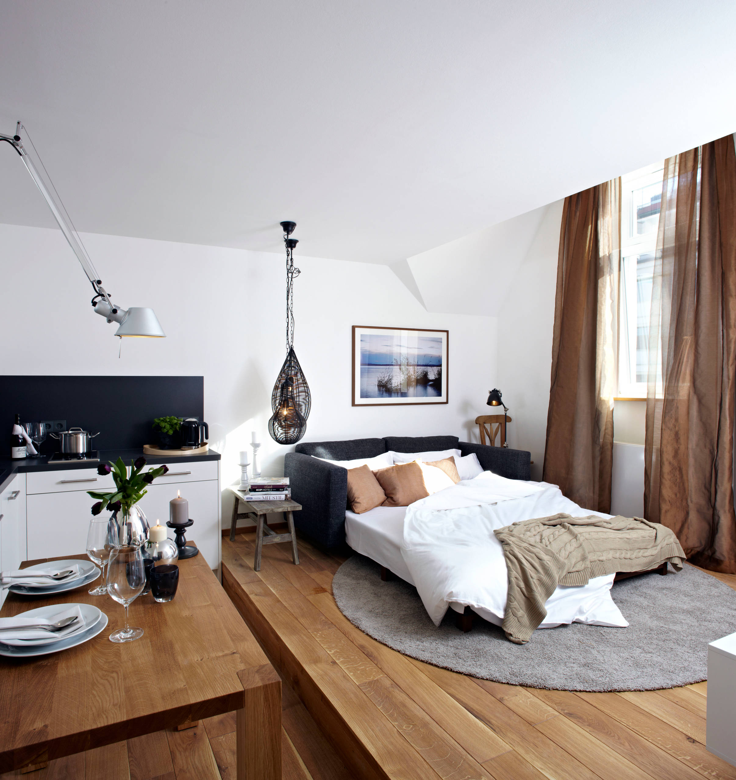 Die Küche ist, objektiv betrachtet, nicht der sinnvollste Ort zum Schlafen. Essensgerüche liegen in der Luft, der Kühlschrank brummt und es bleibt wenig Platz für Privatsphäre. Aber den Bewohnern dieser kleinen Düsseldorfer Wohnung bliebt nichts anderes übrig, als hier einen Schlafplatz einbauen zu lassen. Dafür hat Schreiner und Interior Designer Maximilian von Dieken die Idee des Multifunktionstisches (Mufuti) weiterentwickelt: Wird das Tischgestell gedreht, werden die Tischplatte und die Sitzbank zur großzügigen Liegefläche. Tischler-Maßarbeit vom Feinsten!