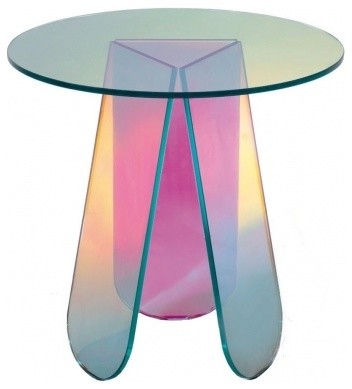 Sie sehen zart aus und sind doch voller Strahlkraft: Möbel und Accessoires, die bunt schimmern, liegen diesen Sommer ebenfalls im Trend. Das irisierende Finish wird unter anderem durch beschichtetes Klarglas erzeugt, wie etwa beim Beistelltisch, den Patricia Urquiola für Glas Italia entwarf. Je nach Einstrahlwinkel erscheint dieser Sommertrend immer wieder in neuen Farben.