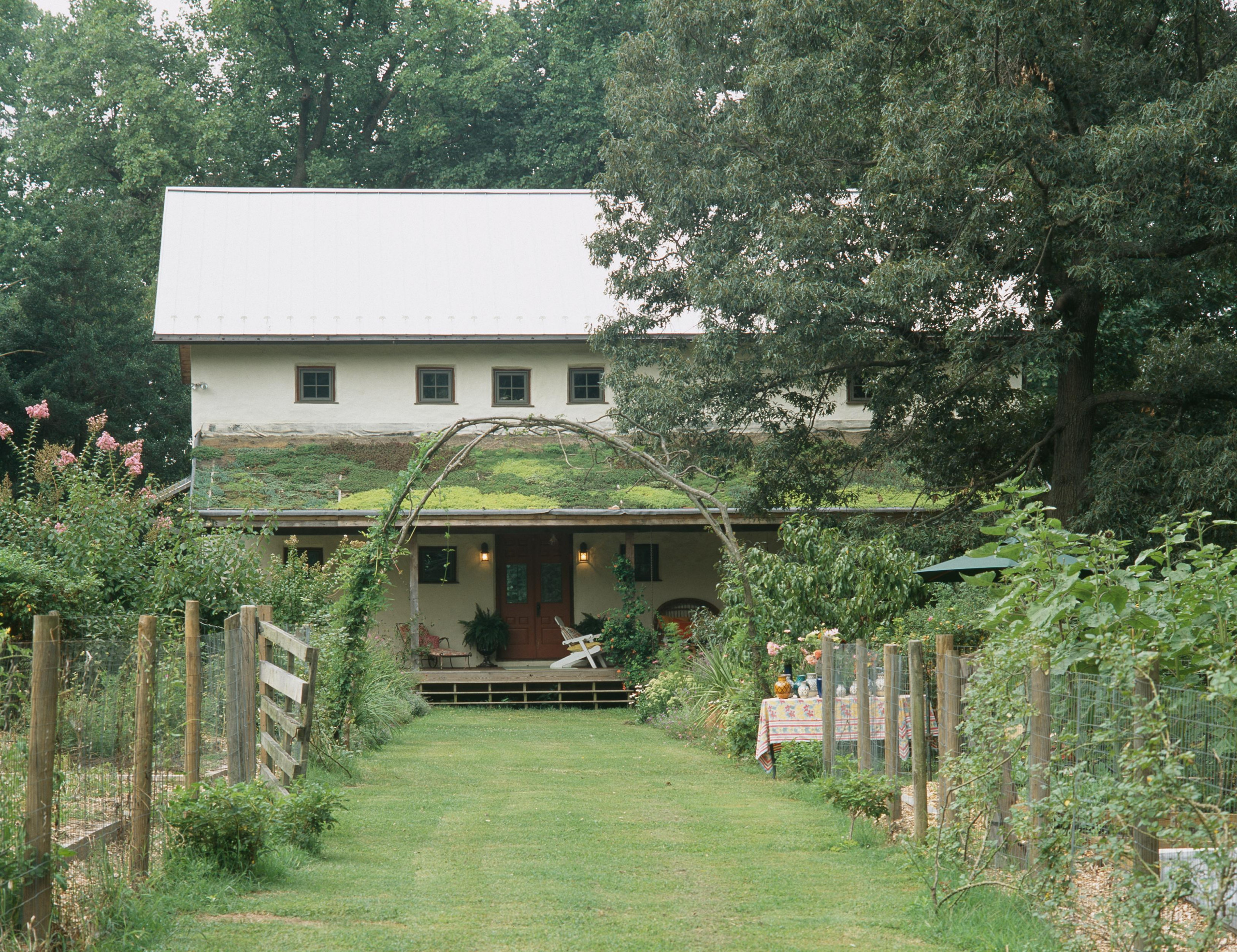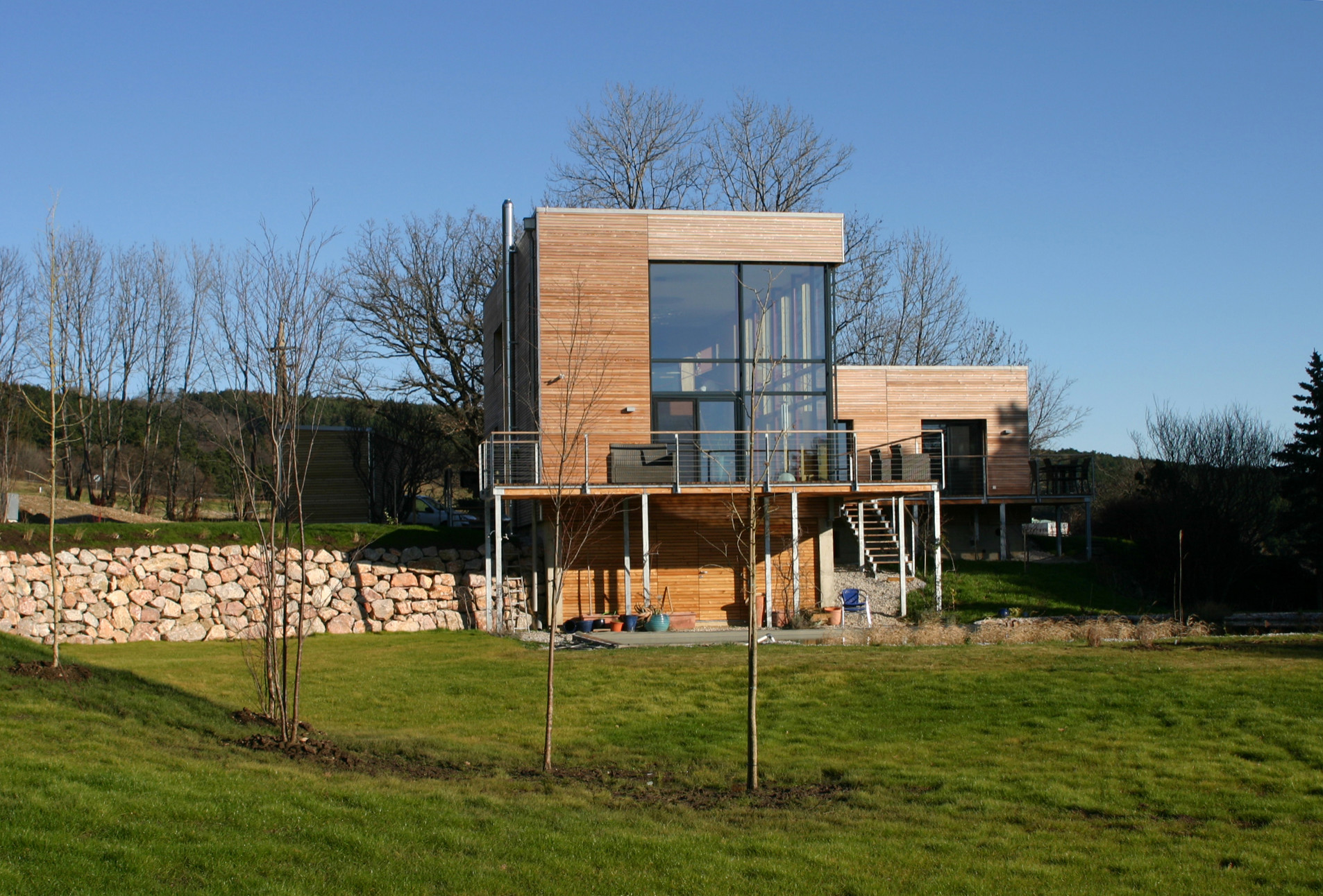 Das Wohn- und Seminarhaus im Bild hat das Architekturbüro Reinberg aus vorgefertigten Bauteilen errichtet, die für dieses Gebäude entwickelt wurden. Sie bestehen aus Holzträgern, die mit Stroh gedämmt und mit lehmverputzten Holzplatten beplankt sind. Die gesamte Konstruktion wurde auf Betonstreifenfundamenten errichtet.