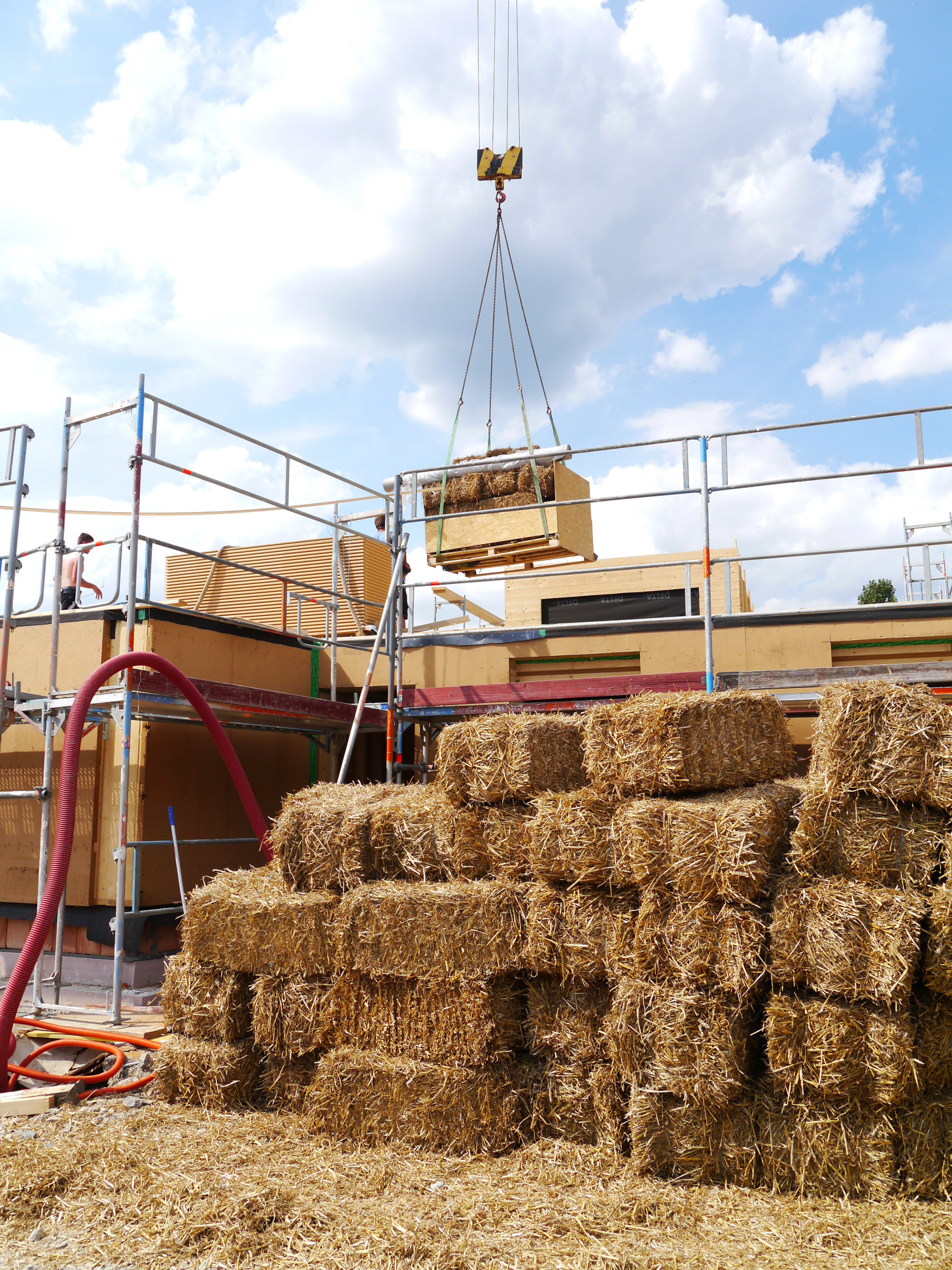 - Ebenso kostet die aufwendige Baustelleneinrichtung mehr, was besonders den Brandschutz und die trockene Lagerung des Strohs betrifft.