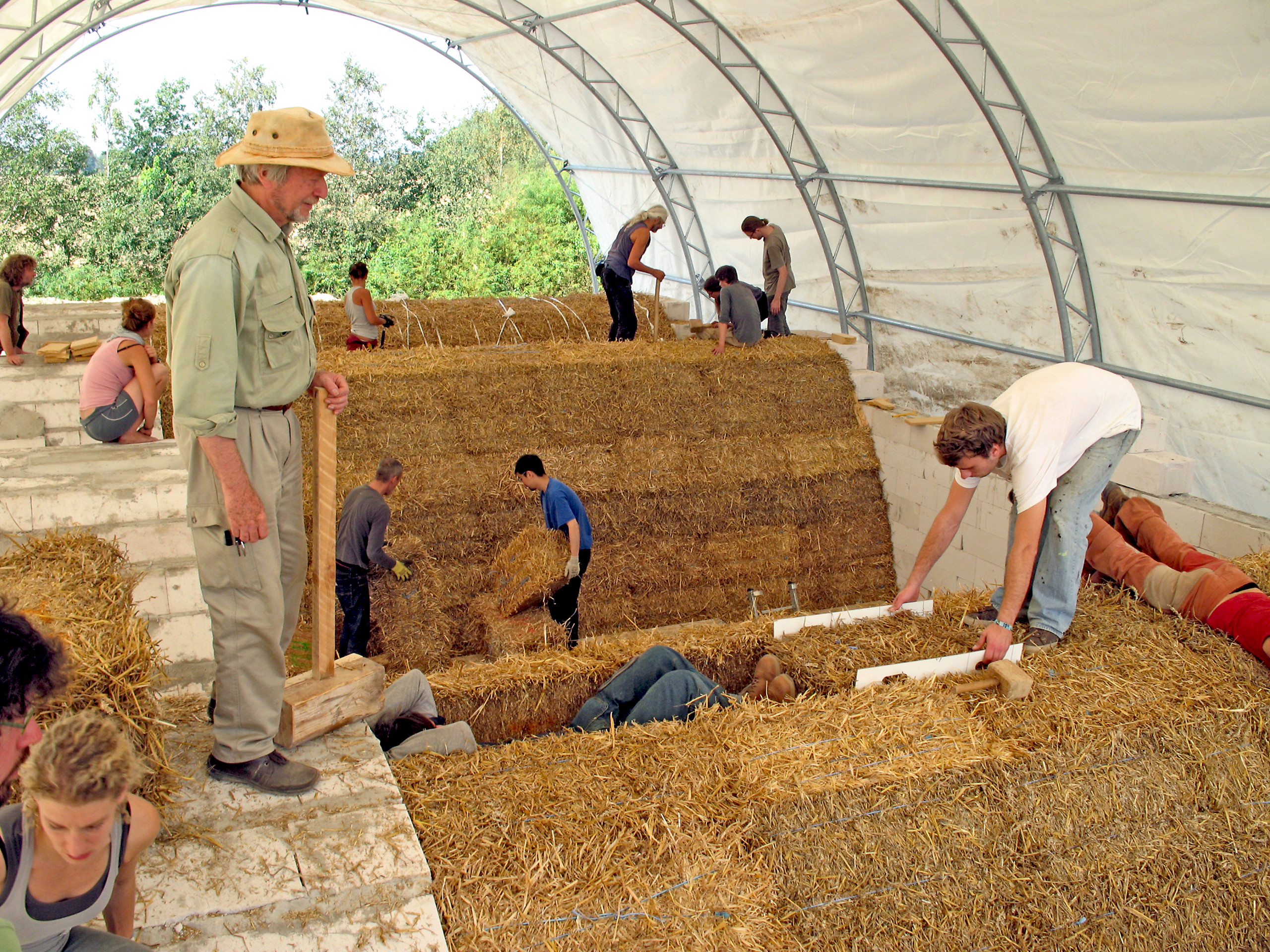 Auch wenn alles geht, was auch im konventionellen Hausbau möglich ist, so ist doch nicht alles sinnvoll. „Ein konventioneller Entwurf wird teurer. Bei einem Giebeldach müssen die Strohballen zurechtgeschnitten werden. Daher ist es besser eine Dachform zu wählen, bei der alle Wände waagerecht abschließen“, rät Minke. Oder gleich ein Tonnengewölbe zu errichten. „Das ist in der Praxis recht kompliziert. Die Kurve muss richtig berechnet und die Ballen müssen konisch zugeschnitten werden“, erklärt Minke, der Projekte wie diese auch in seinem bereits in acht Sprachen übersetzten „Handbuch Strohballenbau“ beschrieben hat.