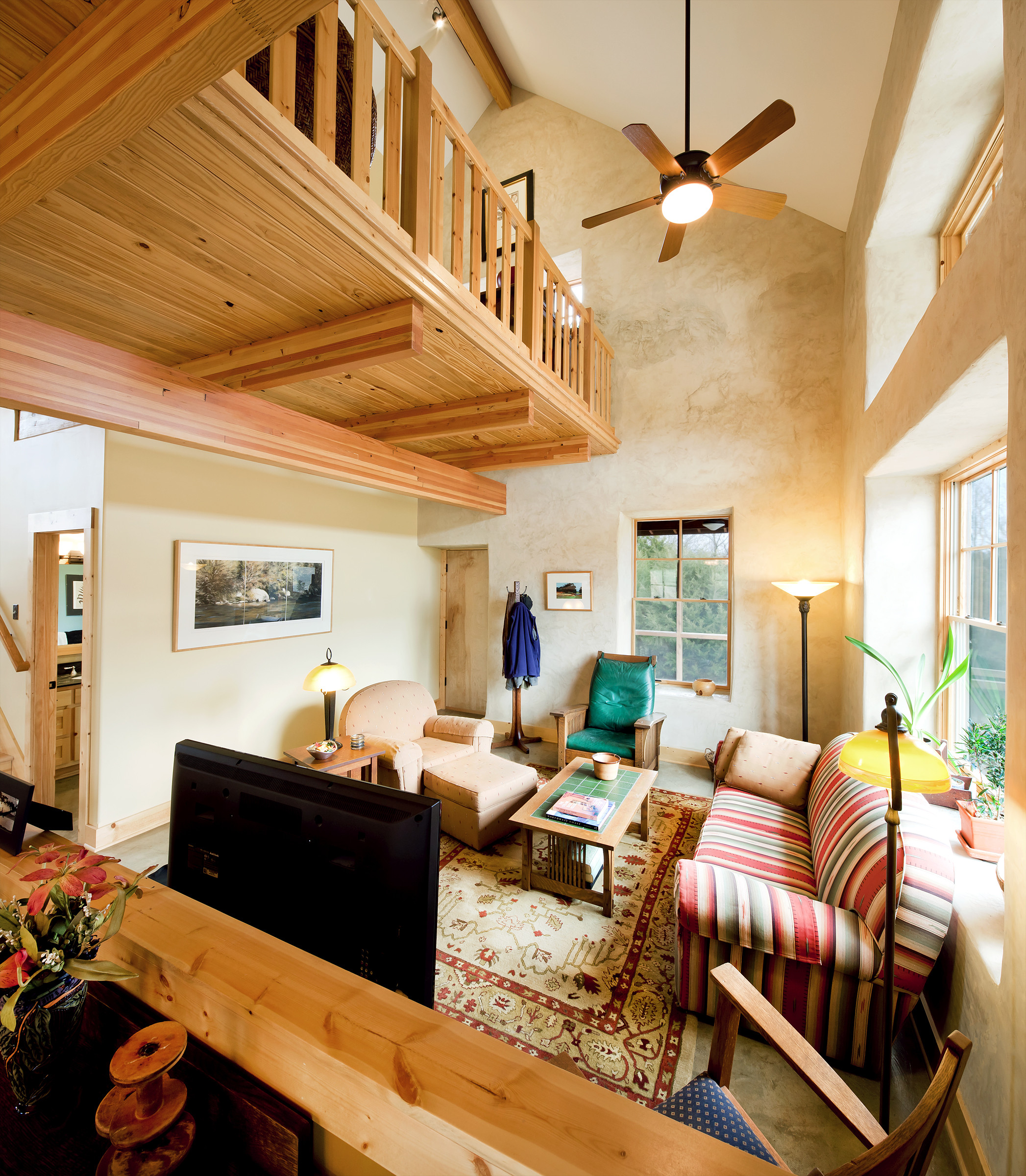 Gemütlich und behaglich ist der offene Wohnbereich in diesem Strohballenhaus. Gut zu sehen, sind die lehmverputzten Wände, die gut zum sichtbaren Fachwerk und dem knorrigen Kiefernholz passen. Sonnenkollektoren auf dem Garagendach versorgen Warmwasser sowie Fußbodenheizung und minimieren die Energiekosten.