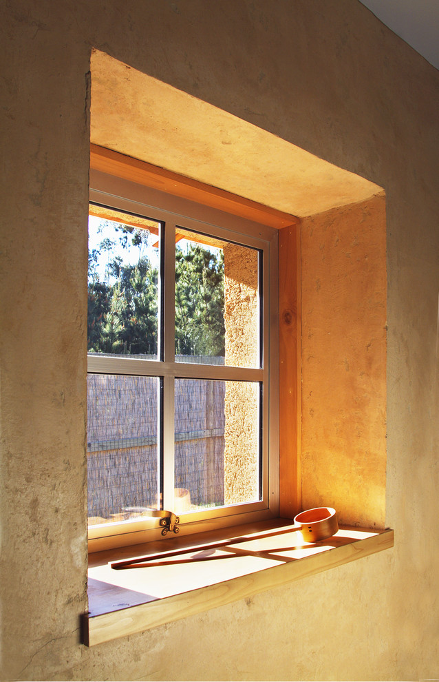 In diesem Strohballenhaus, welches Arkin Tilt Architects in der Nähe von San Francisco gebaut haben, sind die dicken, mit Strohballen gefüllten Außenwände gut auszumachen.