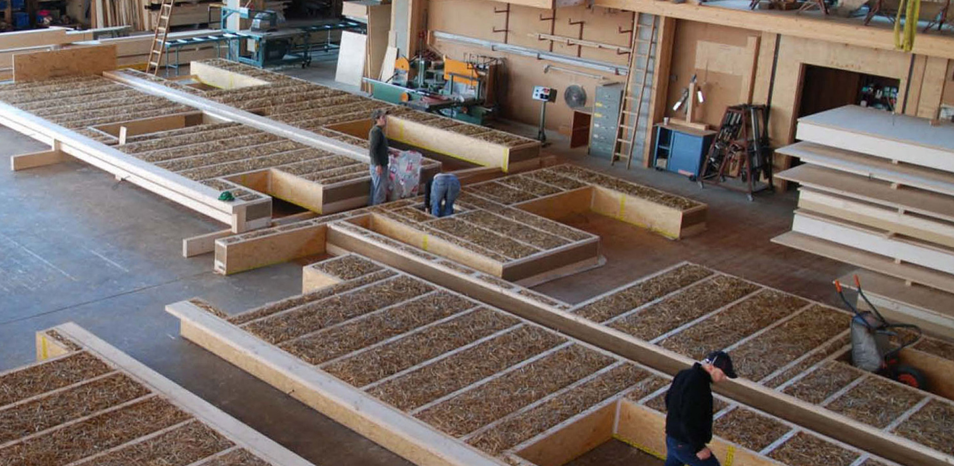 In einer Halle werden die fertigen Holzrahmen mit Strohballen befüllt. Foto: Erz + Gugl, Ostfildern, in: „Handbuch Strohballenbau“, ökobuch Verlag.