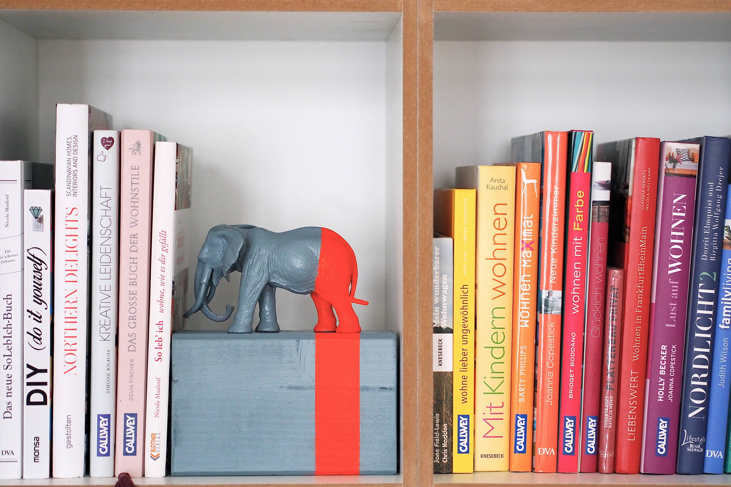 Ein echtes Arbeitstier ist dieser Elefant, der für Ordnung im Bücherregal sorgt. Aufgeklebt auf einen Holzklotz und mit Sprühlack verschönert, ist er nicht nur ein ordentlicher Hingucker, sondern auch eine echte Stütze.