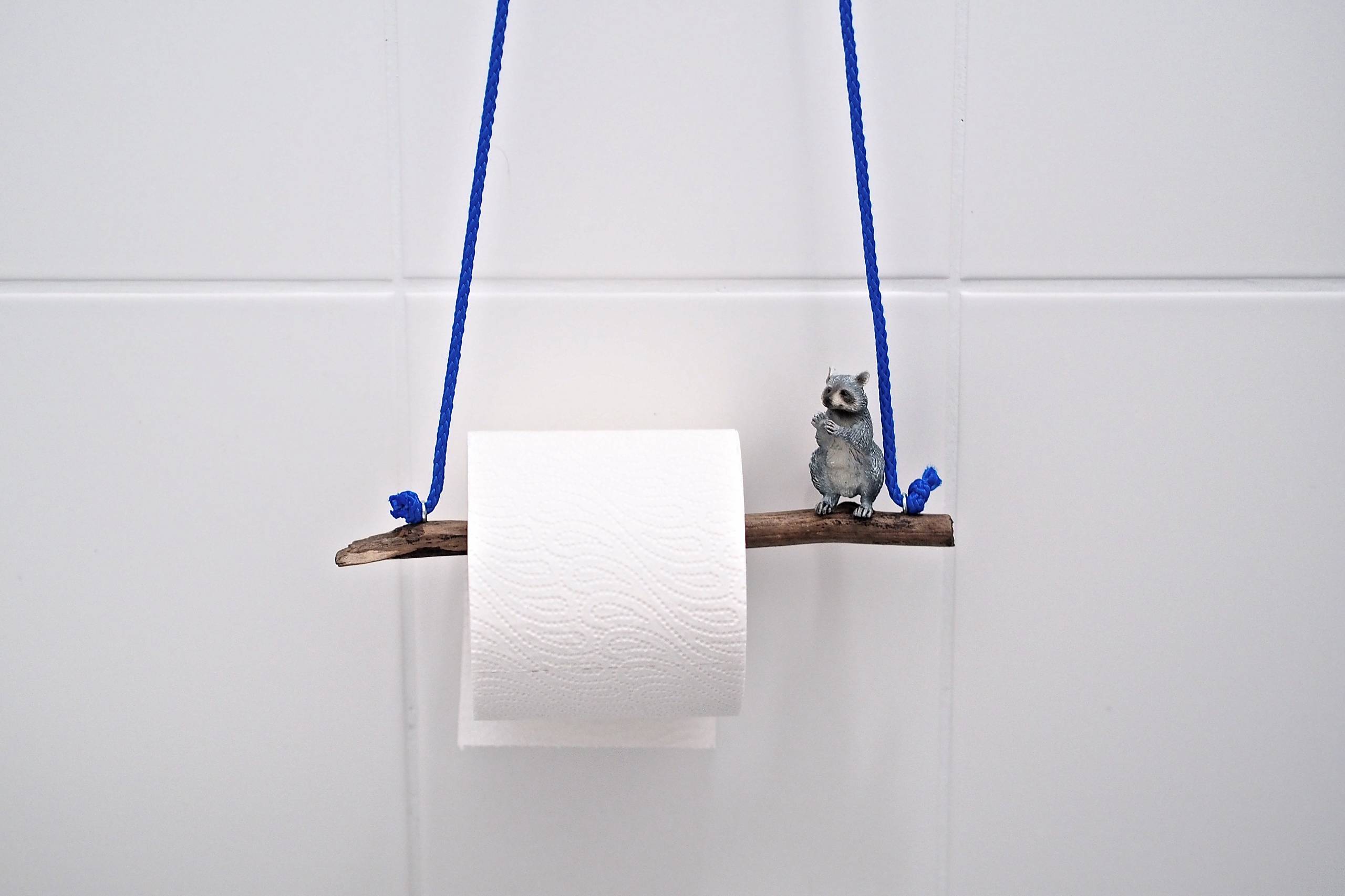 Der Waschbär sitzt auf einem Ast. Dort ist er nicht nur putzig anzusehen, sondern erinnert ganz subtil auch alle seine Besucher ans Händewaschen. Und wer sich im Wald auf die Suche begibt, der findet bestimmt auch einen gekrümmten Stock, den man entweder direkt an der Wand oder mit einem dünnen Seil befestigen kann – am besten in einer knalligen Farbe!