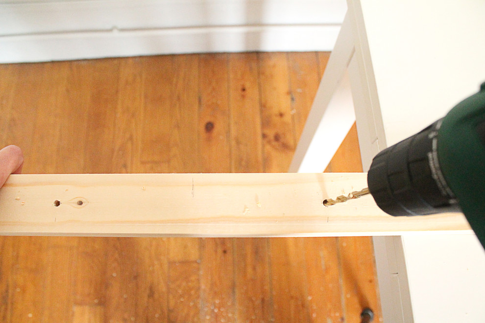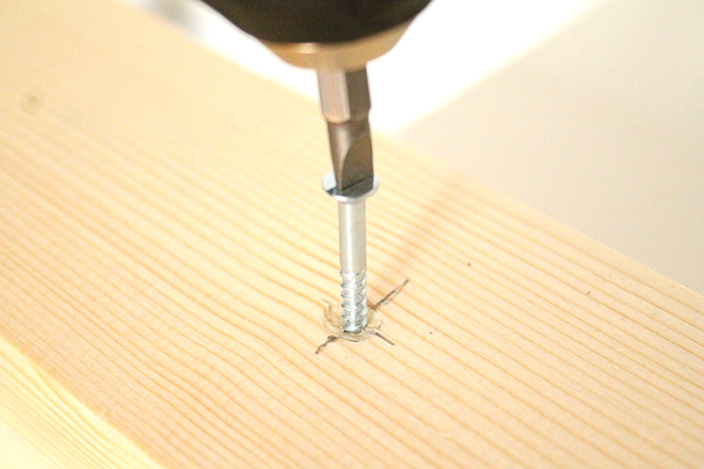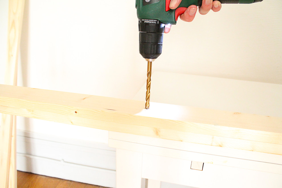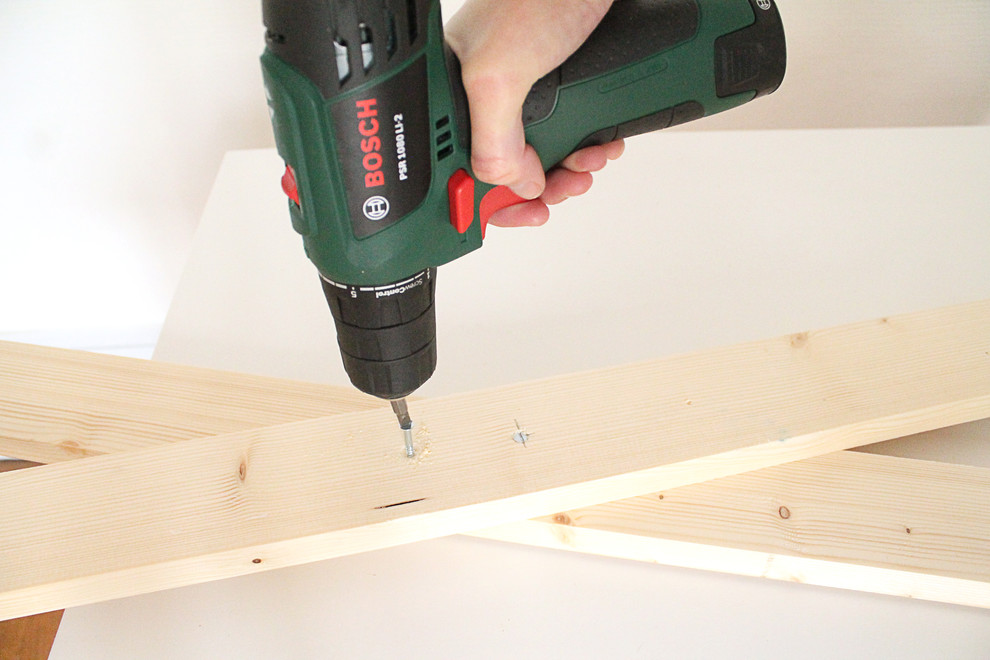 Jetzt wird die Querstrebe an den Beinen befestigt. Folgen Sie den vier oben erläuterten Schritten, um die Löcher vorzubohren und die Querstrebe festzuschrauben (erst Bohrer Größe Drei, dann Bohrer Größe Zwei, am Ende mit Bohrer Größe Acht bzw. Fräskopf ansenken und schließlich die Bretter miteinander verschrauben).