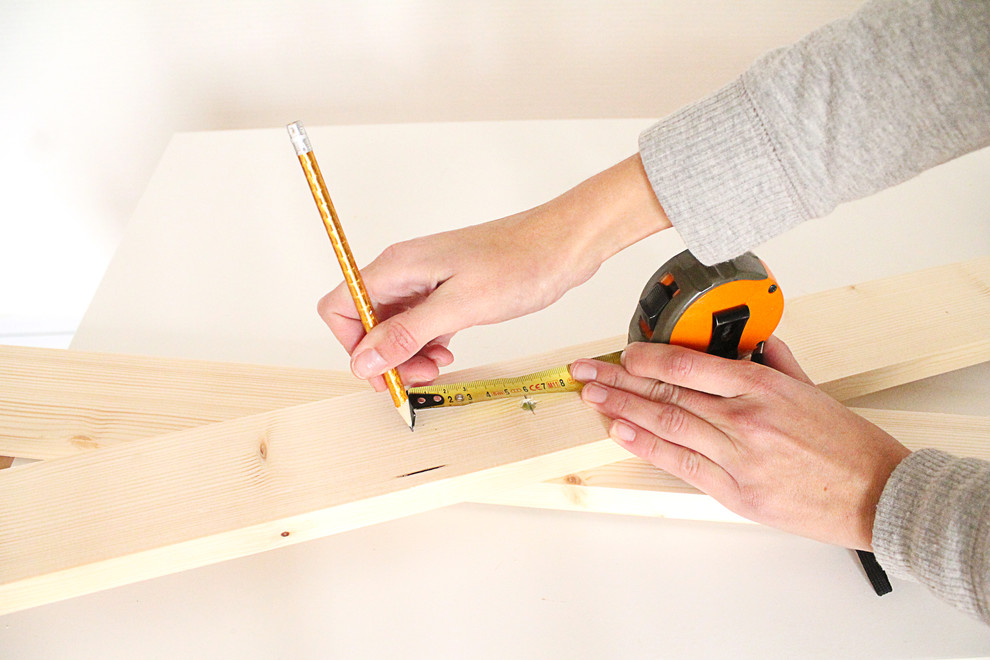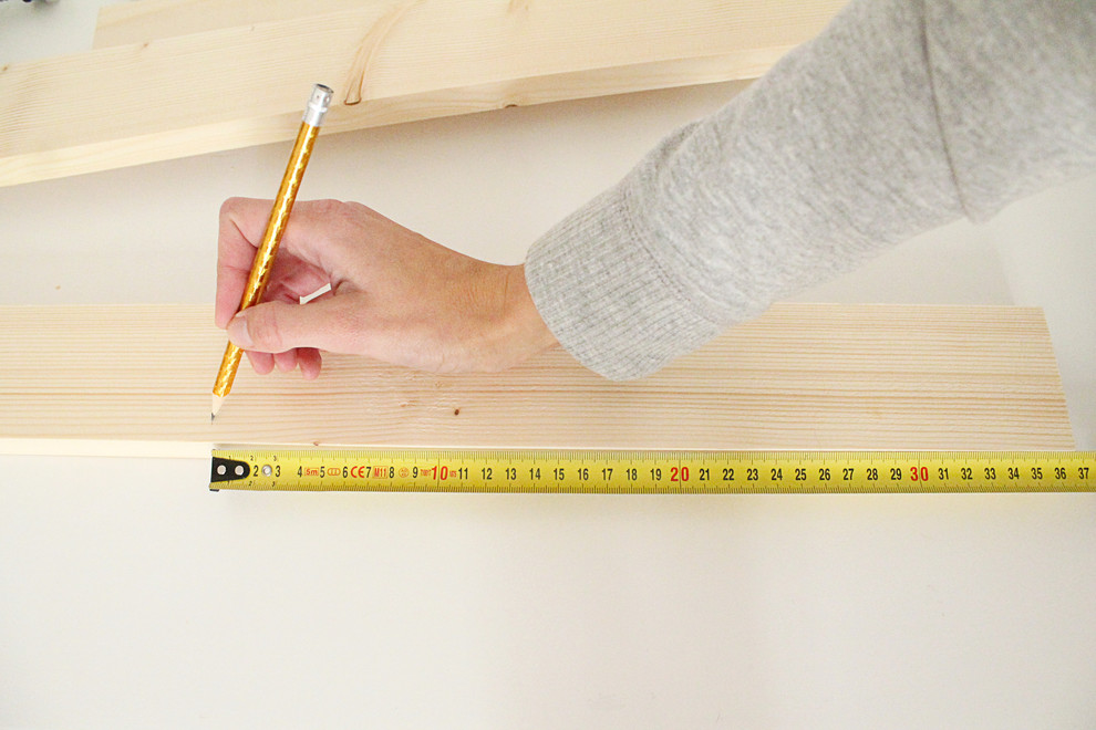 Spreizen Sie nun die beiden Bretter auseinander, um das 50 Zentimeter lange Brett als Querstrebe einzupassen. Messen Sie dafür auf den 180 Zentimeter langen Brettern vom unteren Rand 37 Zentimeter ab und markieren Sie die Stelle.