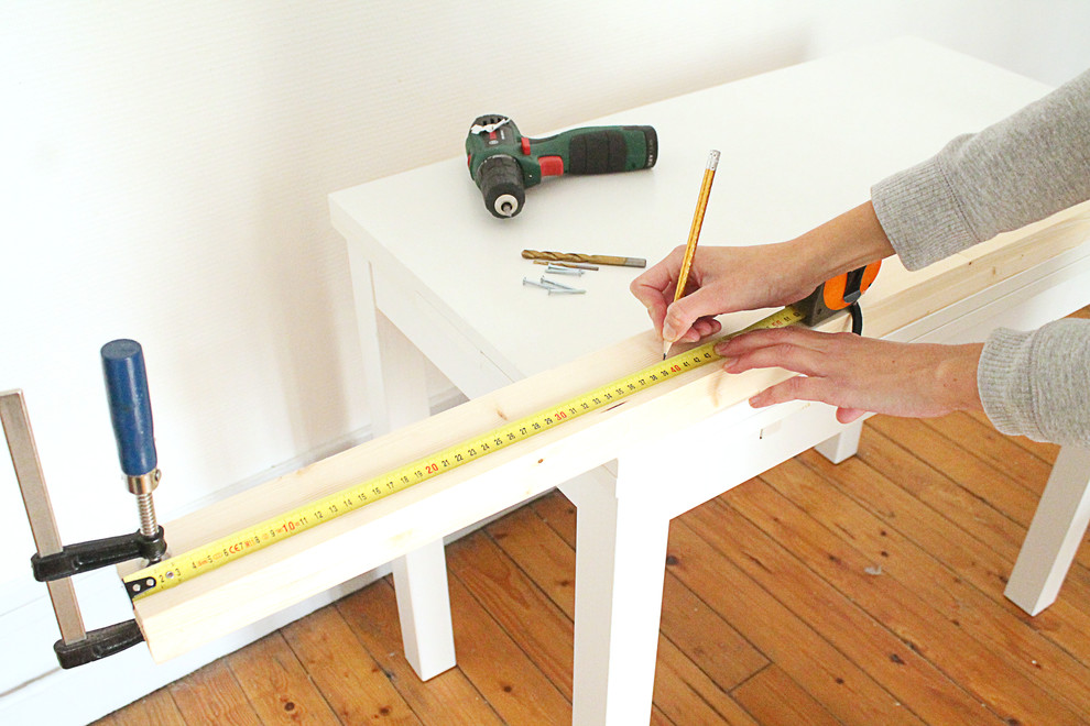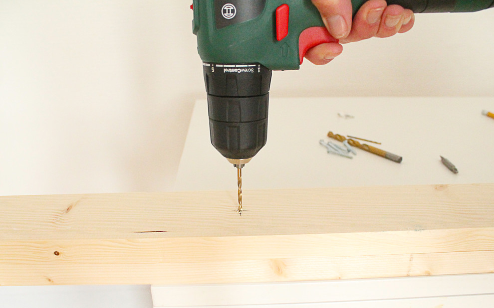 Falls Sie als Ablage lieber ein normales Regalbrett verwenden wollen, können Sie diesen Schritt zunächst auslassen und das Brett direkt wie gleich beschrieben an den horizontalen Streben befestigen.