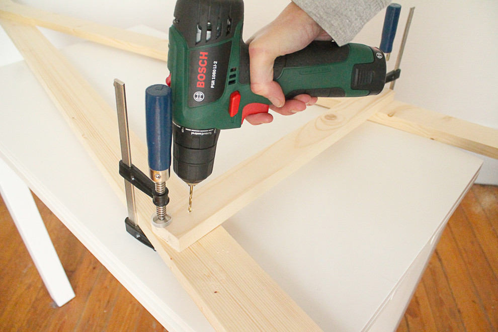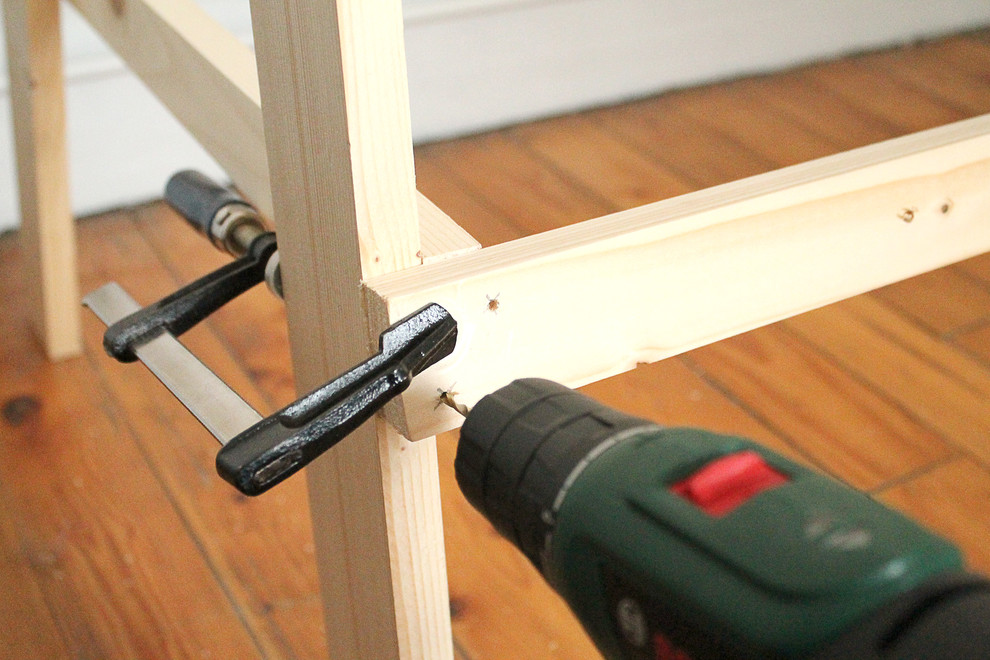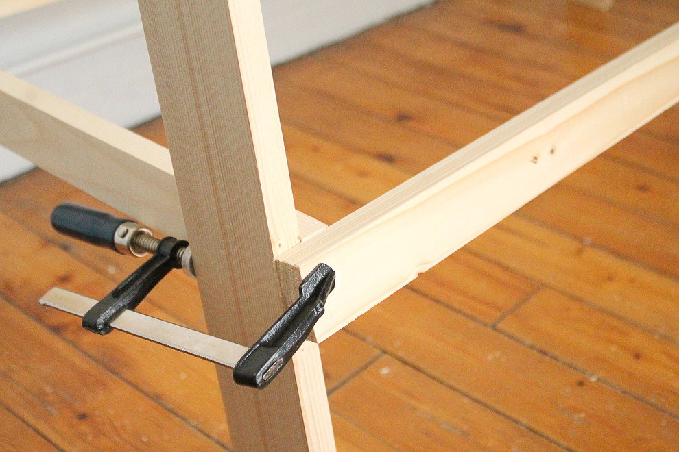 Dafür werden zunächst die Querlatten montiert. Sie werden auf Höhe der Mittelstrebe und im rechten Winkel zu den Beinen angebracht. Am Besten fixieren Sie sie ebenfalls mit Schraubzwingen, damit sie beim Zusammenschrauben nicht verrutschen.