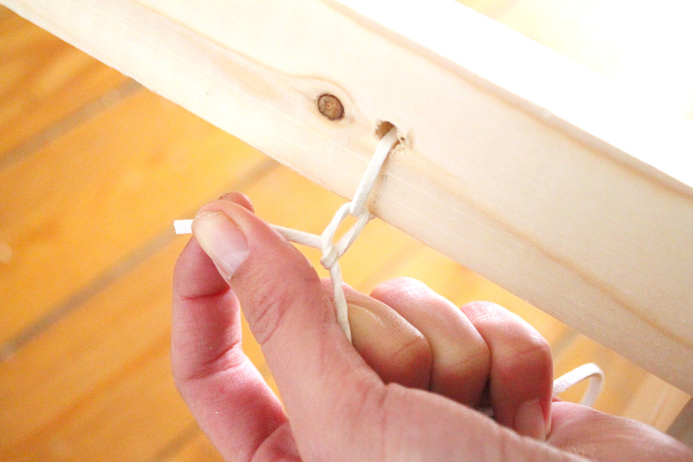 Als Nächstes wird das Ablagefach fertiggestellt. Dafür wird das Seil zunächst von innen nach außen durch das erste Loch gefädelt und innen mit einem Knoten befestigt.