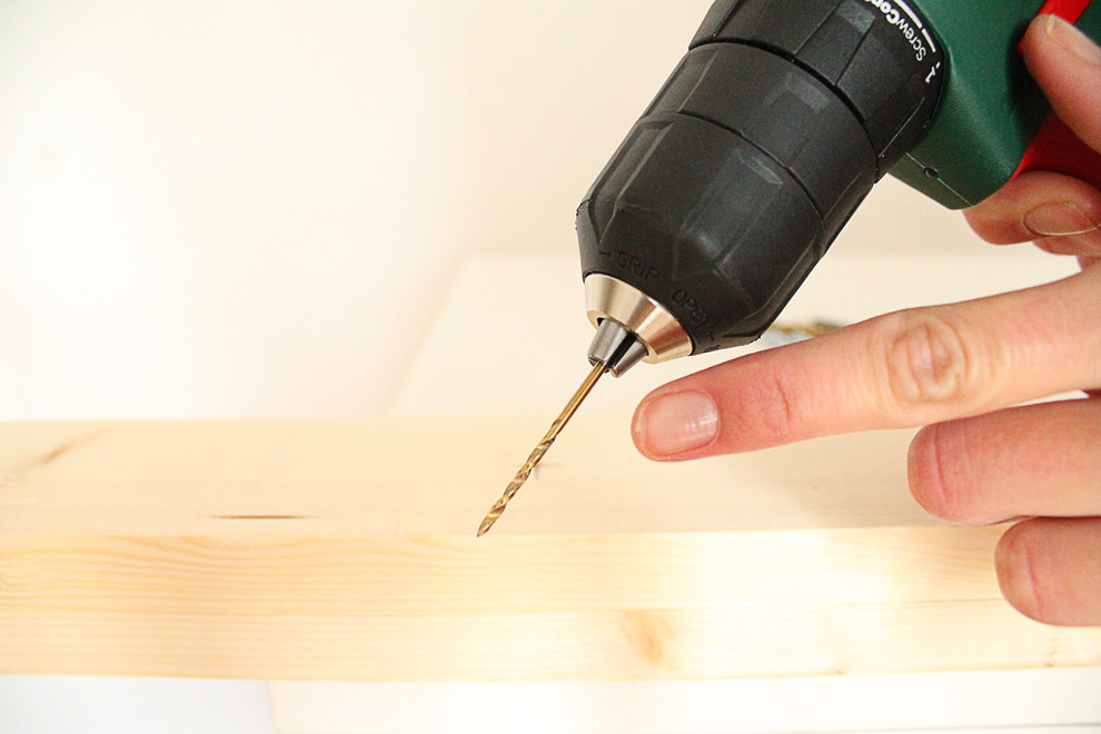 Zuerst bohren Sie mit dem Drei-Millimeter-Bohrer einmal komplett durch das obere Brett.