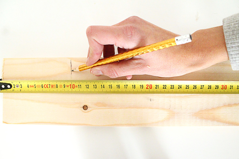 Messen Sie von einer Seite 40 Zentimeter ab und markieren Sie die Stelle mittig auf dem Brett. An dieser Stelle werden die Bretter miteinander verschraubt.