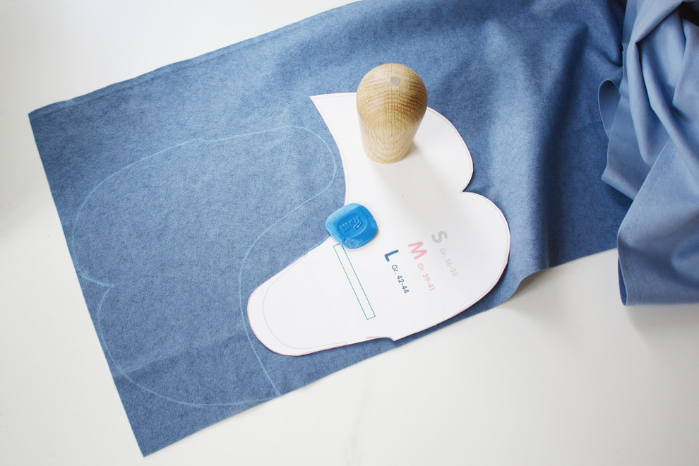 Die entstandene Hausschuh-Schablone übertragen Sie mit Schneiderkreide auf Ihren Stoff (ich habe mit einem veganen Veloursleder gearbeitet). Beschweren Sie Ihre Schablone mit einem Gewicht. Das erleichtert das genaue Umzeichnen.