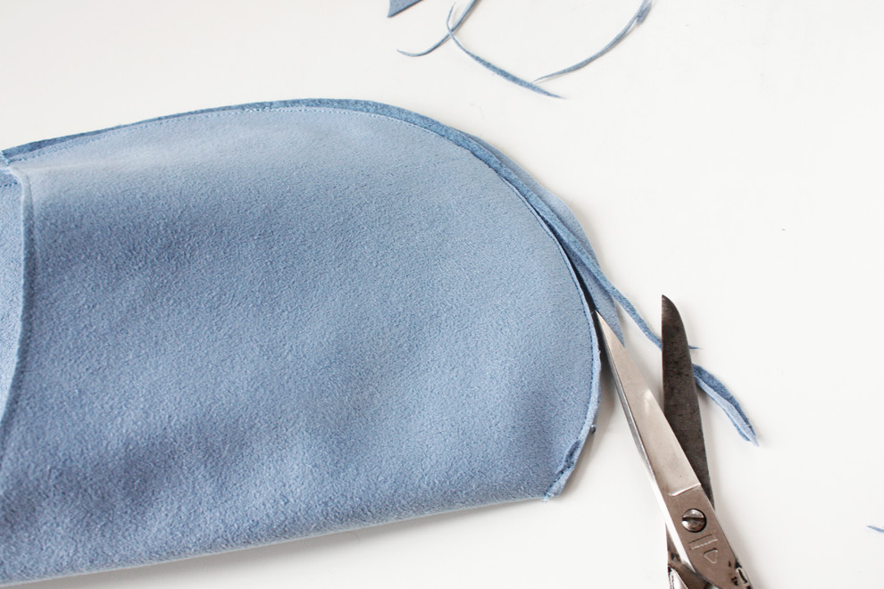 Wenn Sie sich – ganz minimalistisch – für die einfache Naht entschieden haben, müssen Sie die Kante nur noch mit der Schere säubern. Dafür schneiden Sie wie zuvor bei der Innenkante des Fußrückens einmal dicht entlang der Naht.