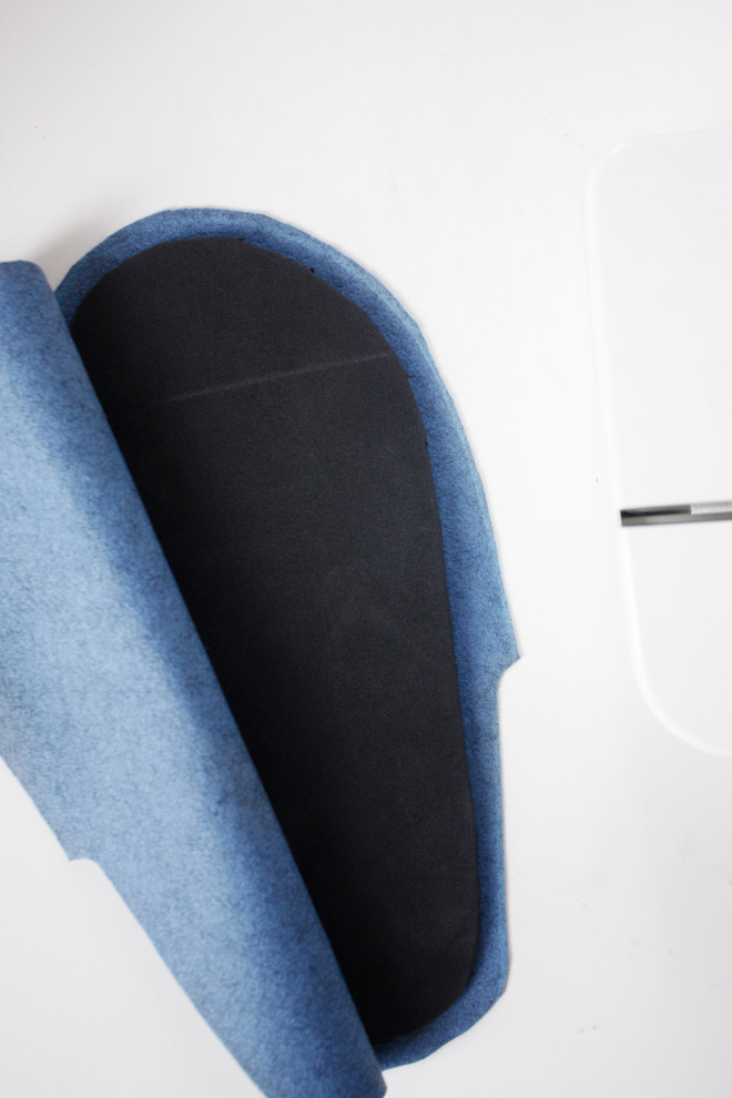 Sollten Ihre Stofflagen leicht verrutschen, ist das gar kein Problem, solange beide Stoffteile rund um das Polster herum miteinander vernäht sind. Die Kanten werden später noch versäubert, um den Pantoffeln einen perfekten Look zu verleihen.