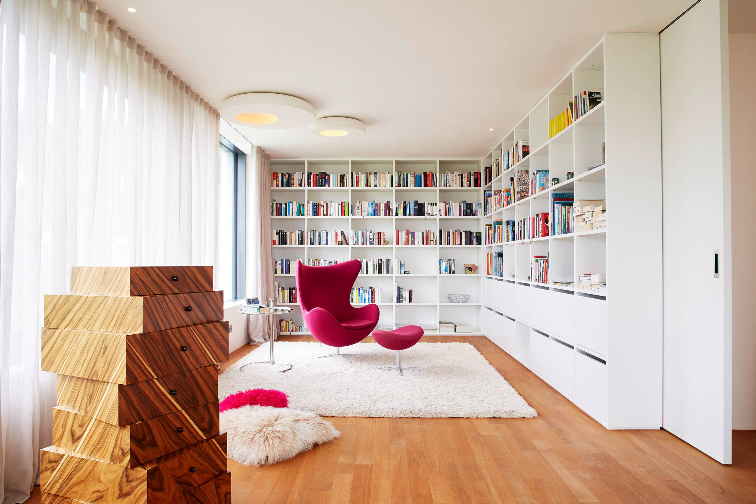 Mit seinen Traummaßen von 107 Zentimetern Höhe und 87 Zentimetern Breite ist der Egg Chair alles andere als klein und zierlich, aber dafür genau richtig zum Reinkuscheln und darin Schmökern. In dieser Villa in Stuttgart ist er mit seinem pinkfarbenen Stoffbezug ein echter Leuchtpunkt in der hell gestalteten Bibliothek.