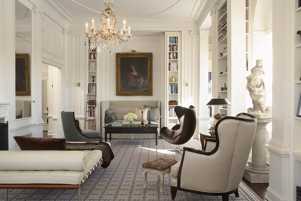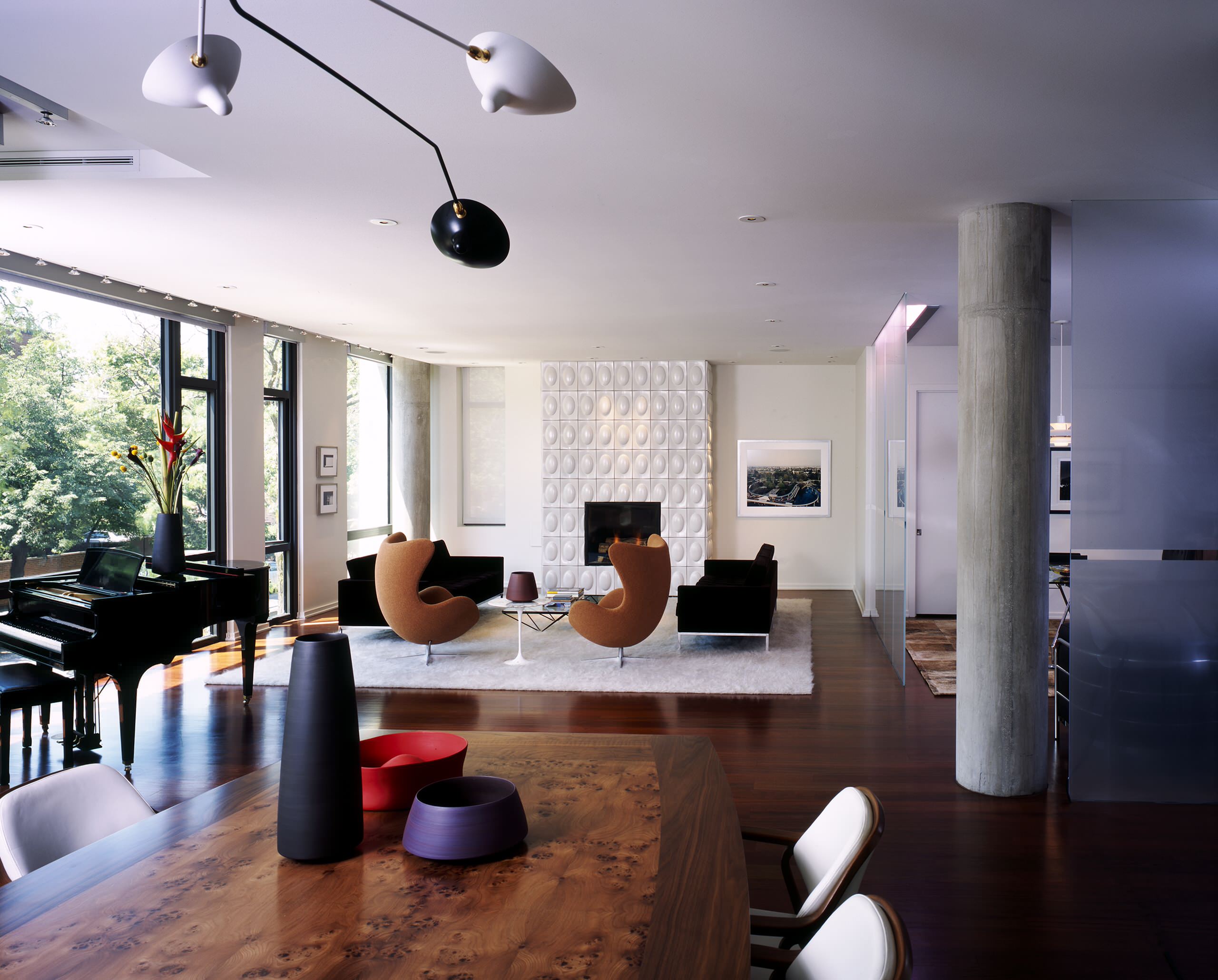 Arne Jacobsen hatte den Ruf, durch und durch Perfektionist zu sein: Er entwarf für das Radisson Hotel in Kopenhagen wirklich alles selbst, von der freischwebenden Treppe bis hin zum Besteck. Ähnlich akribisch wurde auch dieses Zuhause in Chicago eingerichtet, in dem gleich zwei Egg Chairs die perfekte Begleitung für die tiefschwarzen Sofas sind und sich mühelos ins moderne Gesamtkonzept einfügen.