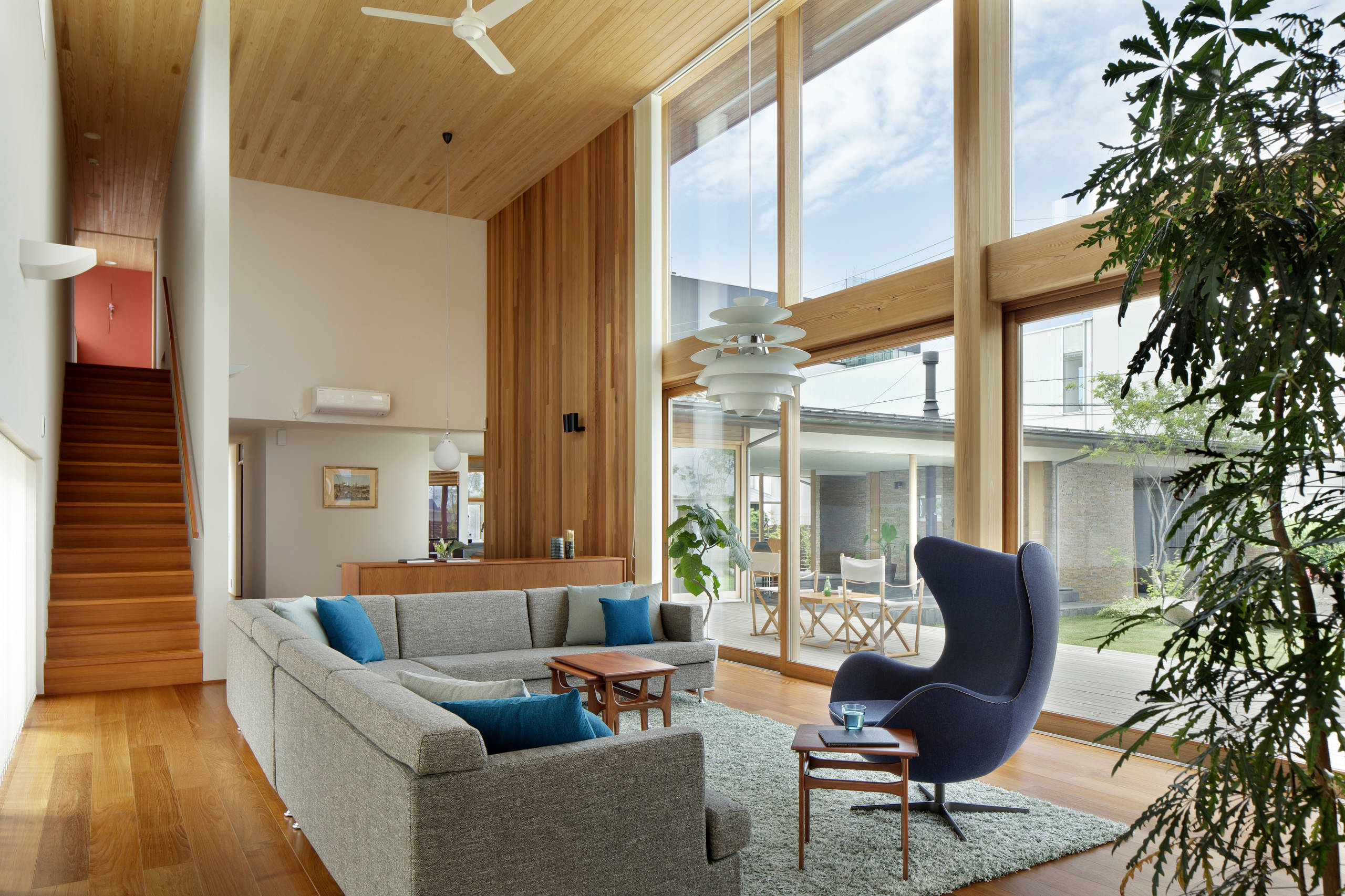 Es heißt, dass Arne Jacobsen sich bei seinem Entwurf vom Womb Chair von Eero Saarinen hat inspirieren lassen – einem Sessel, der vor allem Geborgenheit bietet. Den Egg Chair hat Jacobsen so designt, dass man dank der extra-hohen Lehne vollkommen darin verschwinden kann. Das kommt auch diesem japanischen Zuhause zugute, in dem der Egg Chair inmitten von Glas und klaren Linien jede Menge Gemütlichkeit verspricht.