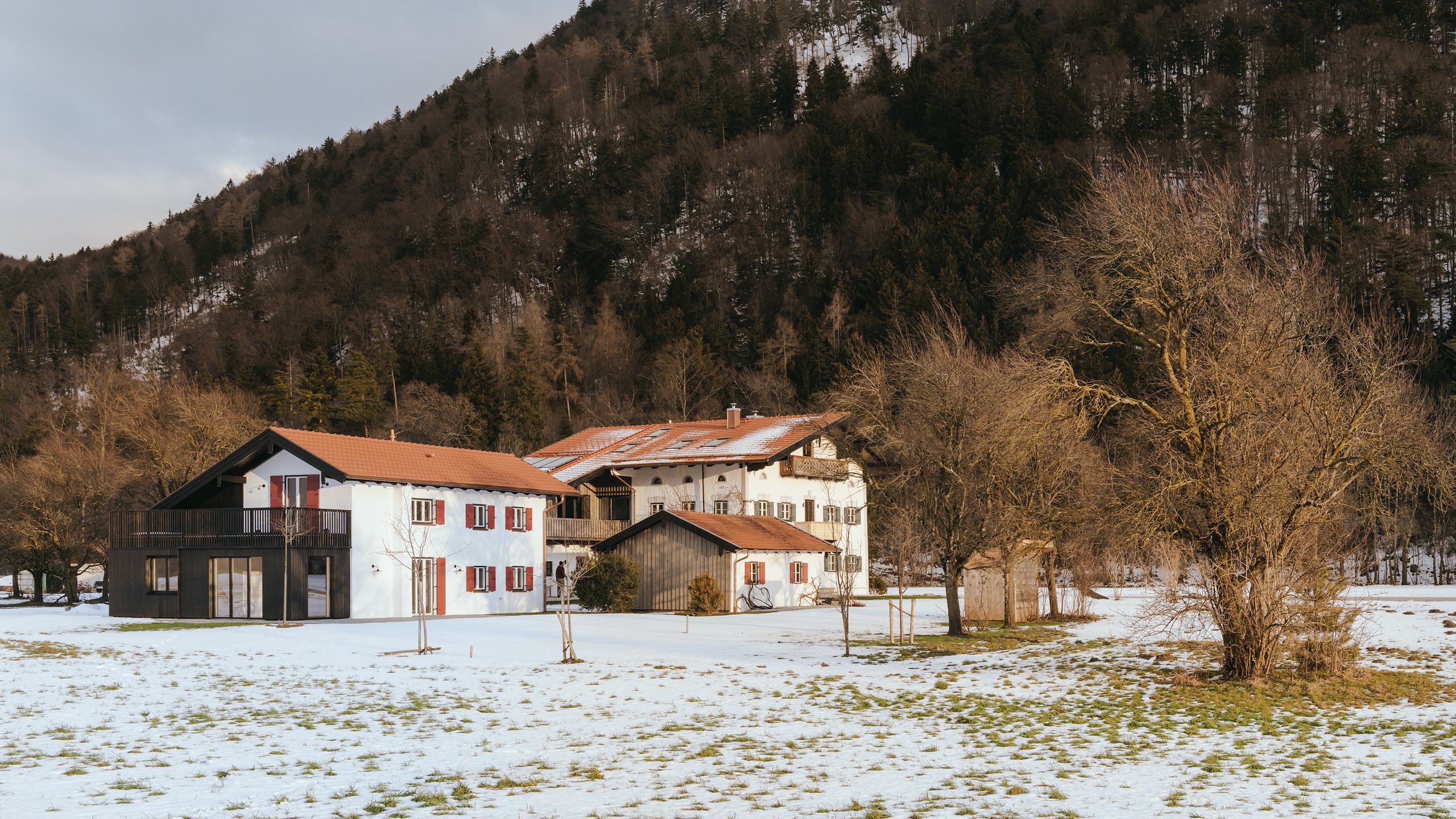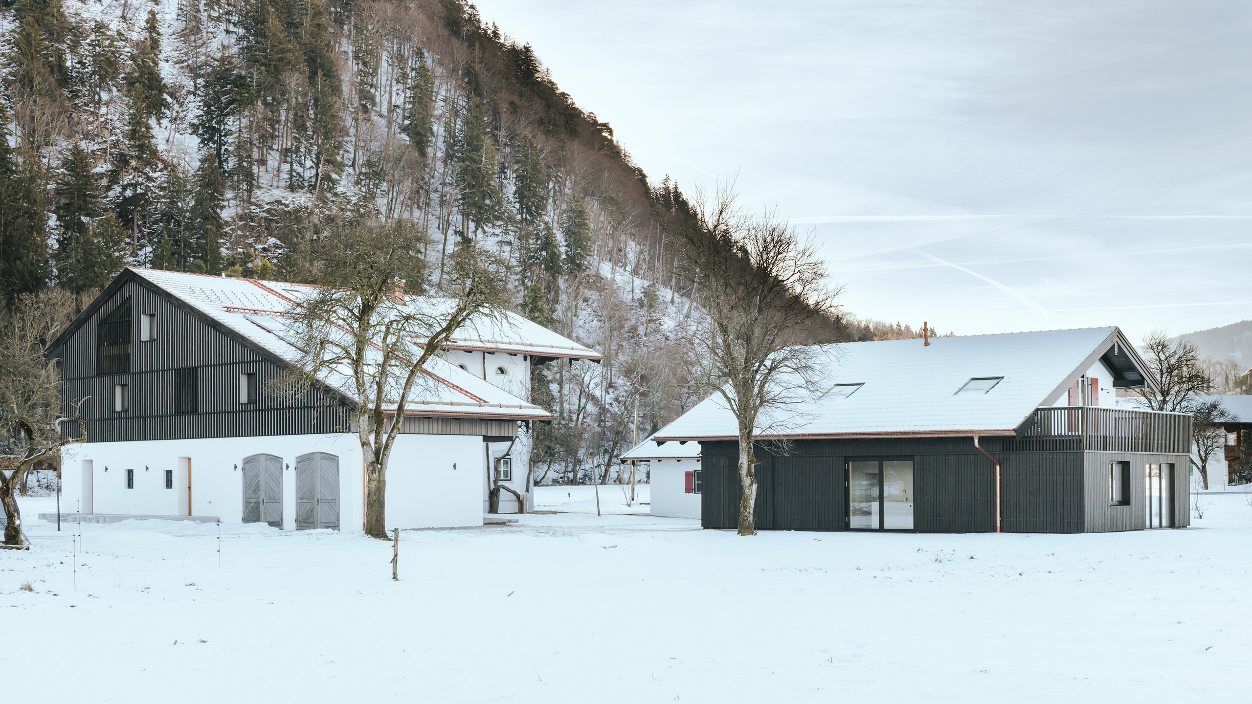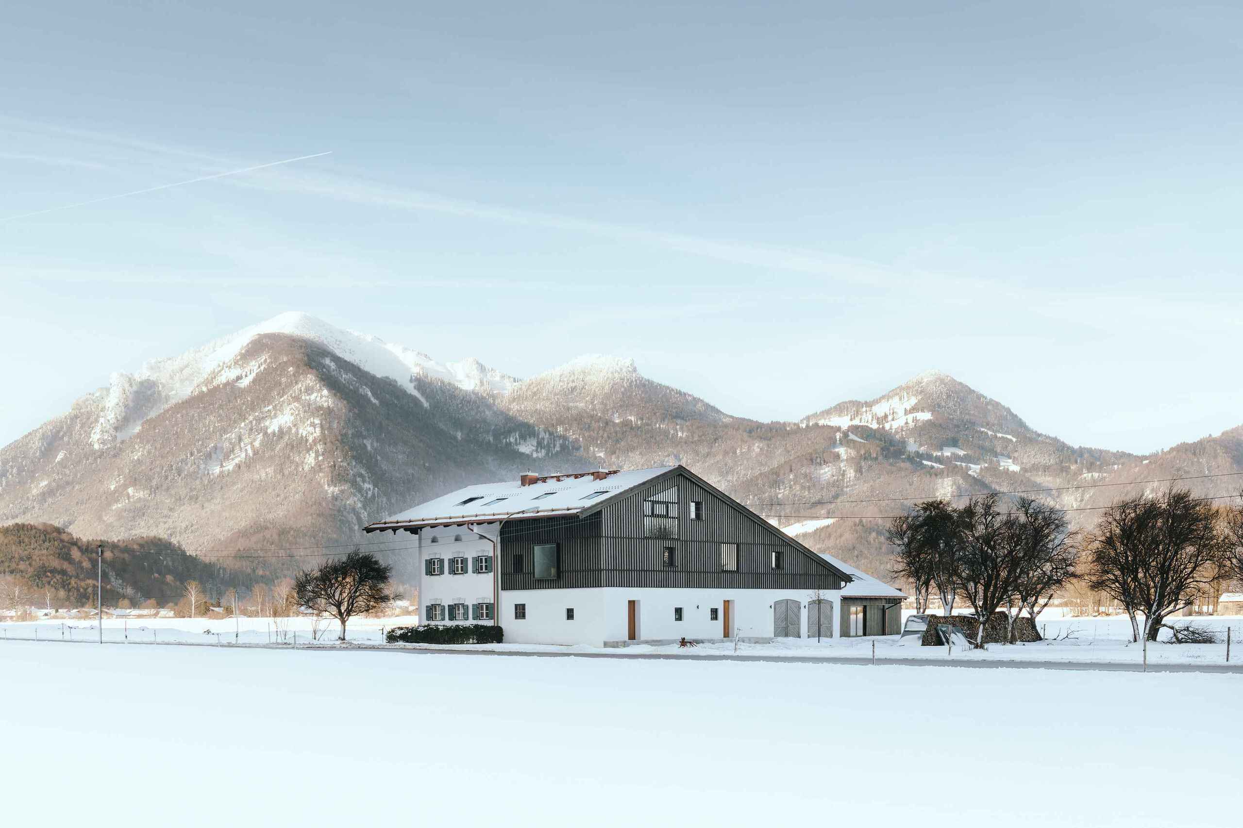 Der Hof liegt abgelegen in ländlicher Ruhe mit einer wunderschönen Aussicht auf das Achental, inmitten der Chiemgauer Alpen. Diese Aussicht sollte von allen Ecken und Winkeln der Wohneinheiten zu bewundern sein. Diverse Fenster und Glaswände sorgen zudem für den nötigen Lichteinfall. Der luftige Charakter der Räume sollte den Bewohnern ein größeres Raum- und Wohlgefühl vermitteln. „Die fast klösterliche Ruhe, die das Haus ausstrahlt, kann man gut spüren“, meint der Architekt.