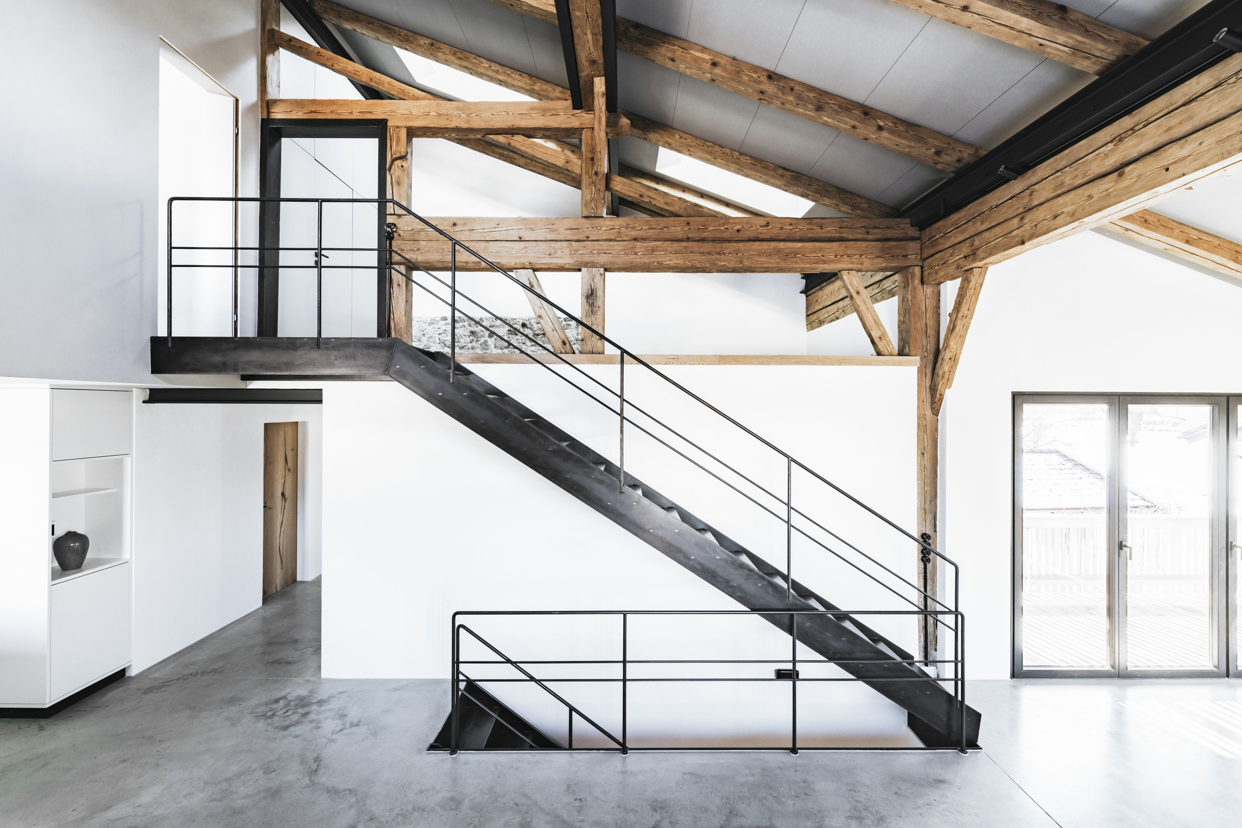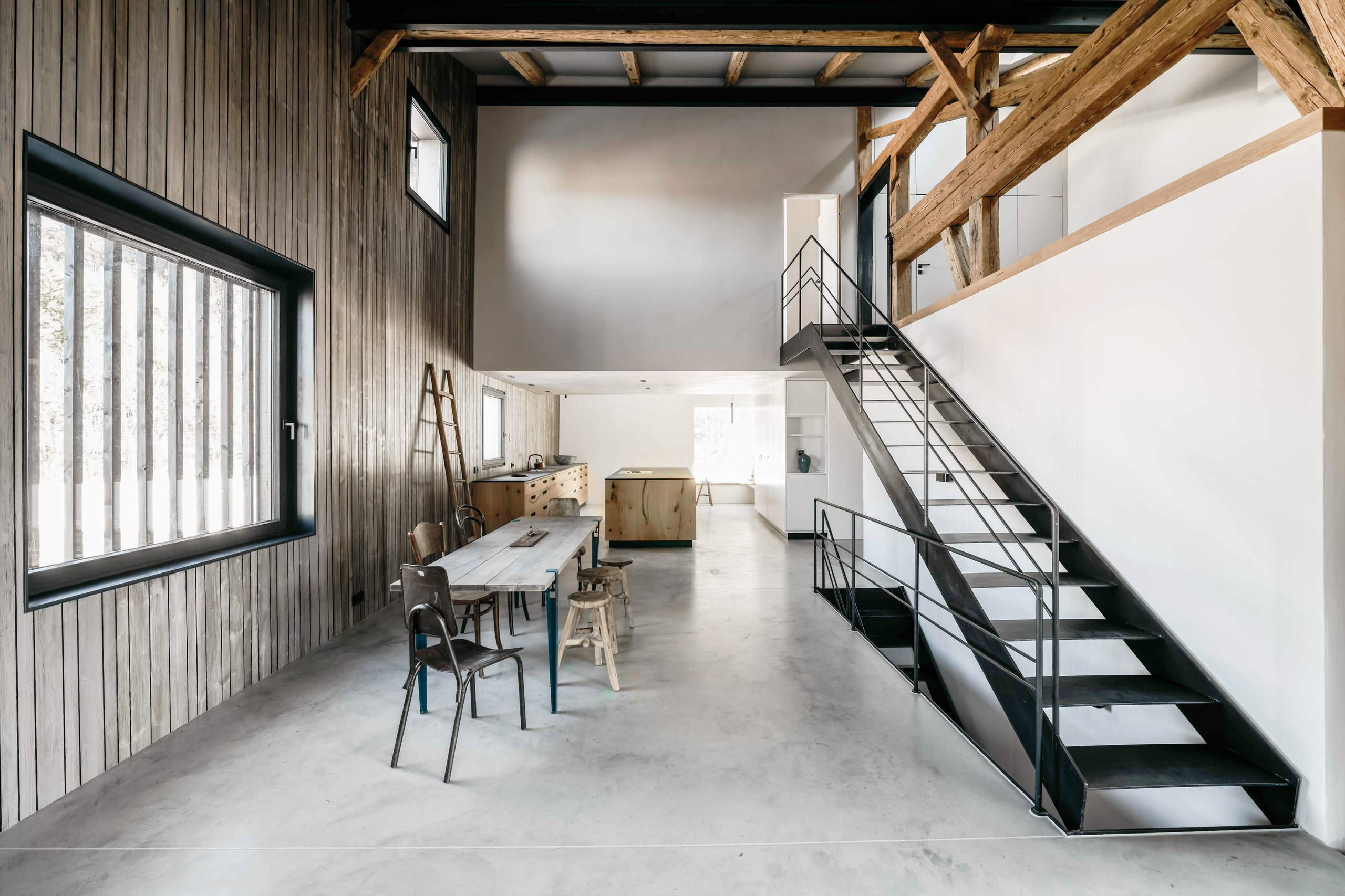 In der Tenne wurde früher oben das Heu aufbewahrt, unten befand sich der Kuhstall. Im oberen Geschoss im verschlossenen Kubus befindet sich das zum Teil komplett verglaste Schlafzimmer. Die Stahltreppe führt in das Schlafzimmer, rechts daneben ist die Tür zum Bad.