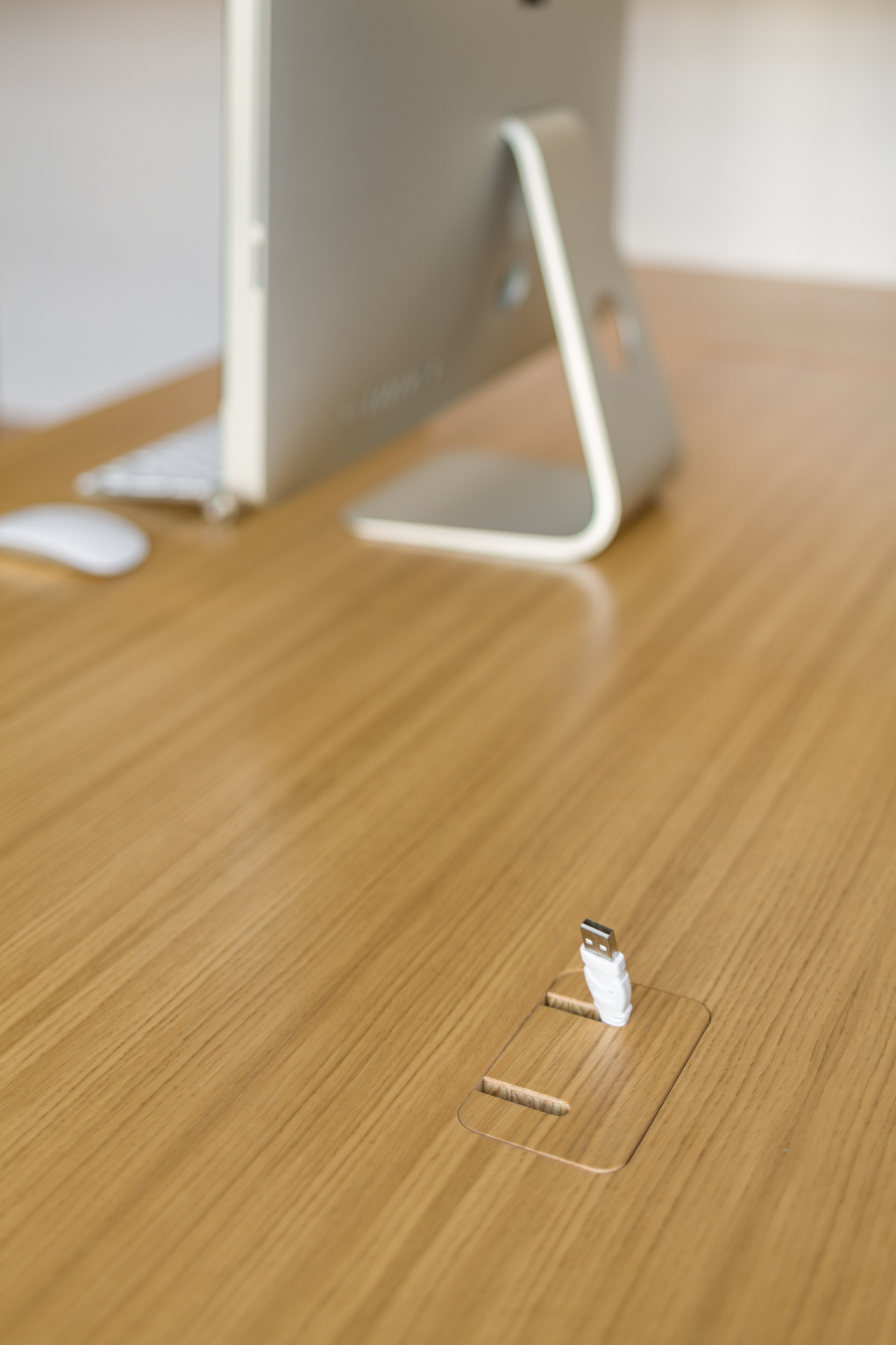 Detailstark ist auch der Schreibtisch: die flächenbündigen Auslassungen für den Kabelsalat dort lassen den Arbeitsplatz clean und aufgeräumt wirken.