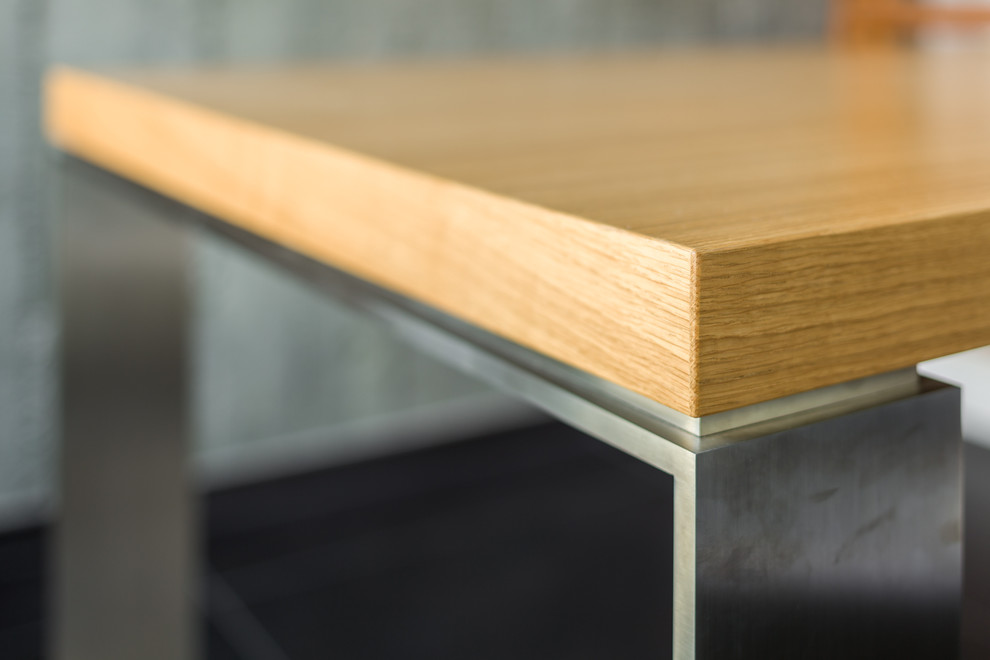 Auch die zusätzliche Stahlplatte, die zwischen dem Edelstahlfuß und der Eichenplatte eingesetzt wurde, zeigt die feine Detailarbeit der Experten.