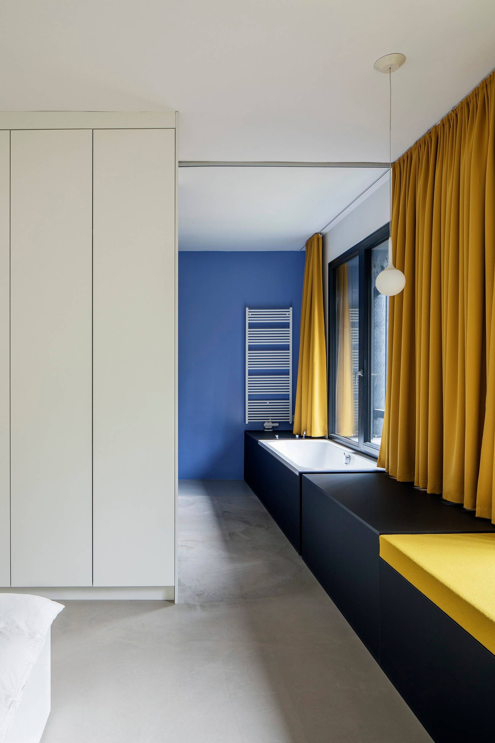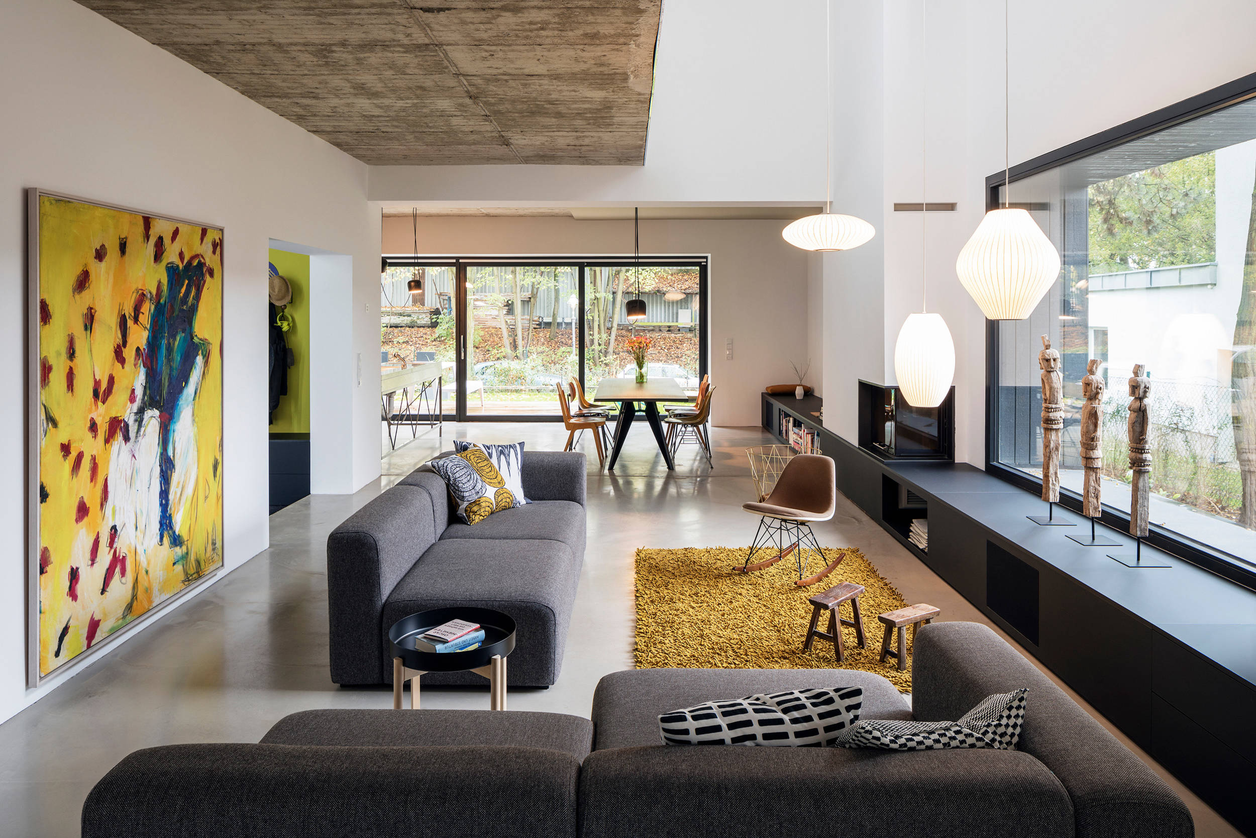 Neben Schwarz, Betongrau und Weiß verwendeten die Architekten nur wenige Akzentfarben in den Innenräumen. So wirkt die Einrichtung sachlich und doch lebendig.