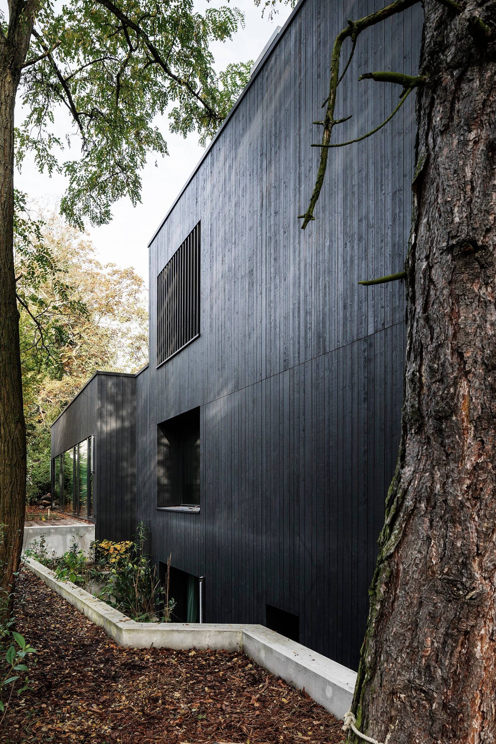 Das Haus behielt zwar seine Grundform, doch mit seiner vorgehängten, hinterlüfteten Fassade aus schwarz lasiertem Holz fügt es sich nun harmonisch in seine Umgebung ein und verschmilzt optisch fast mit dem Baumbestand auf dem Grundstück.