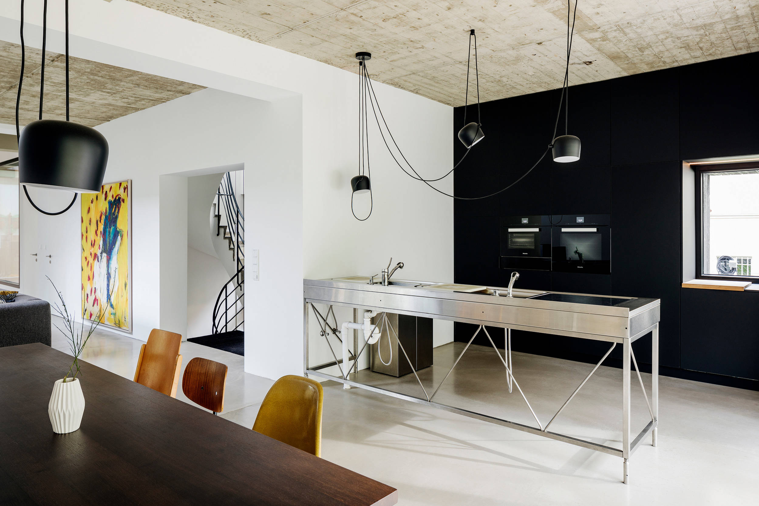 Die offene Küche besteht aus einer schwarzen Einbauwand und einem vorgelagerten Edelstahlblock. Der war bereits vorhanden und sollte in das Einrichtungskonzept integriert werden.