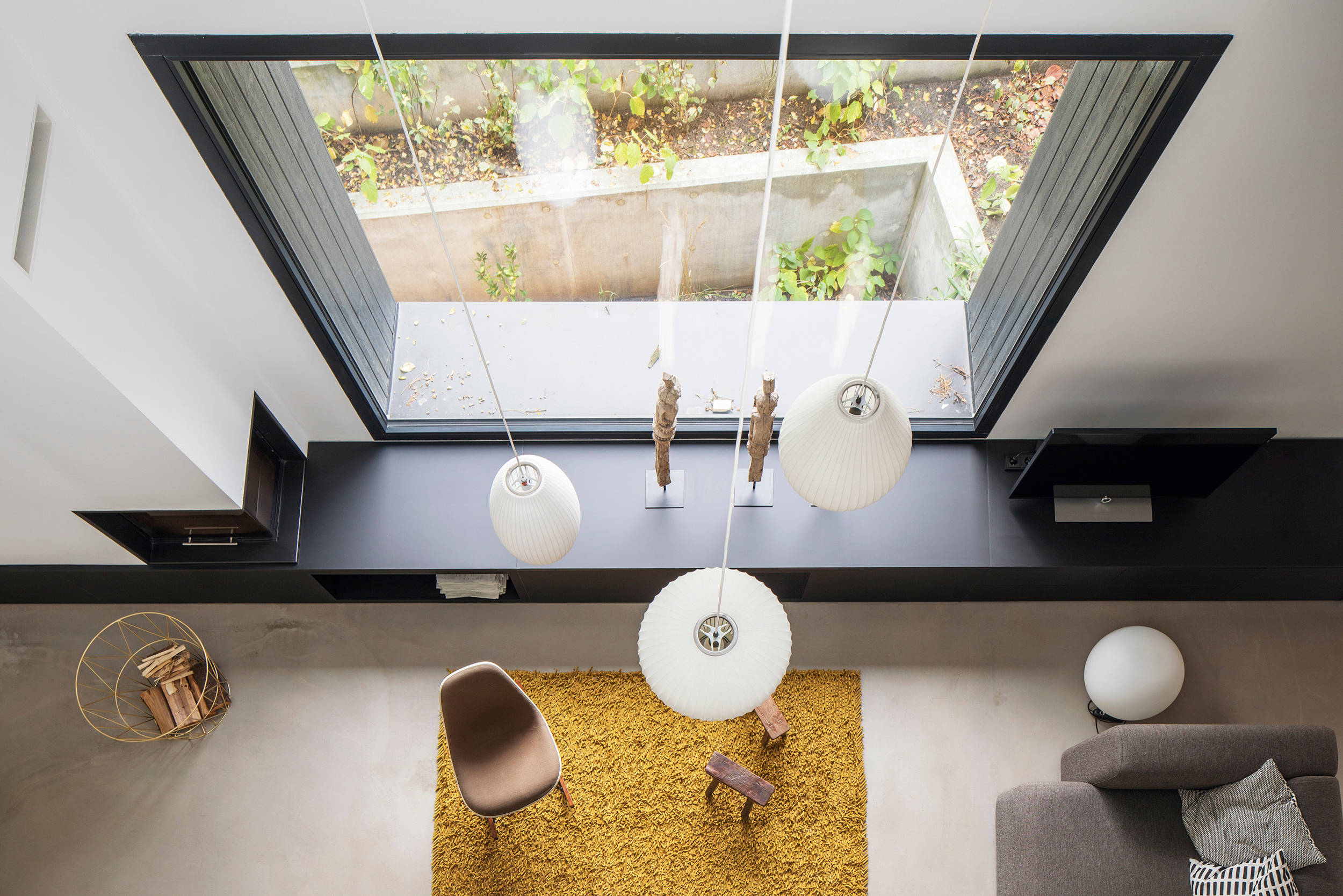 Der Blick aus dem Obergeschoss in den Wohnbereich. Von hier aus wird die extratiefe Außenwand besonders gut sichtbar