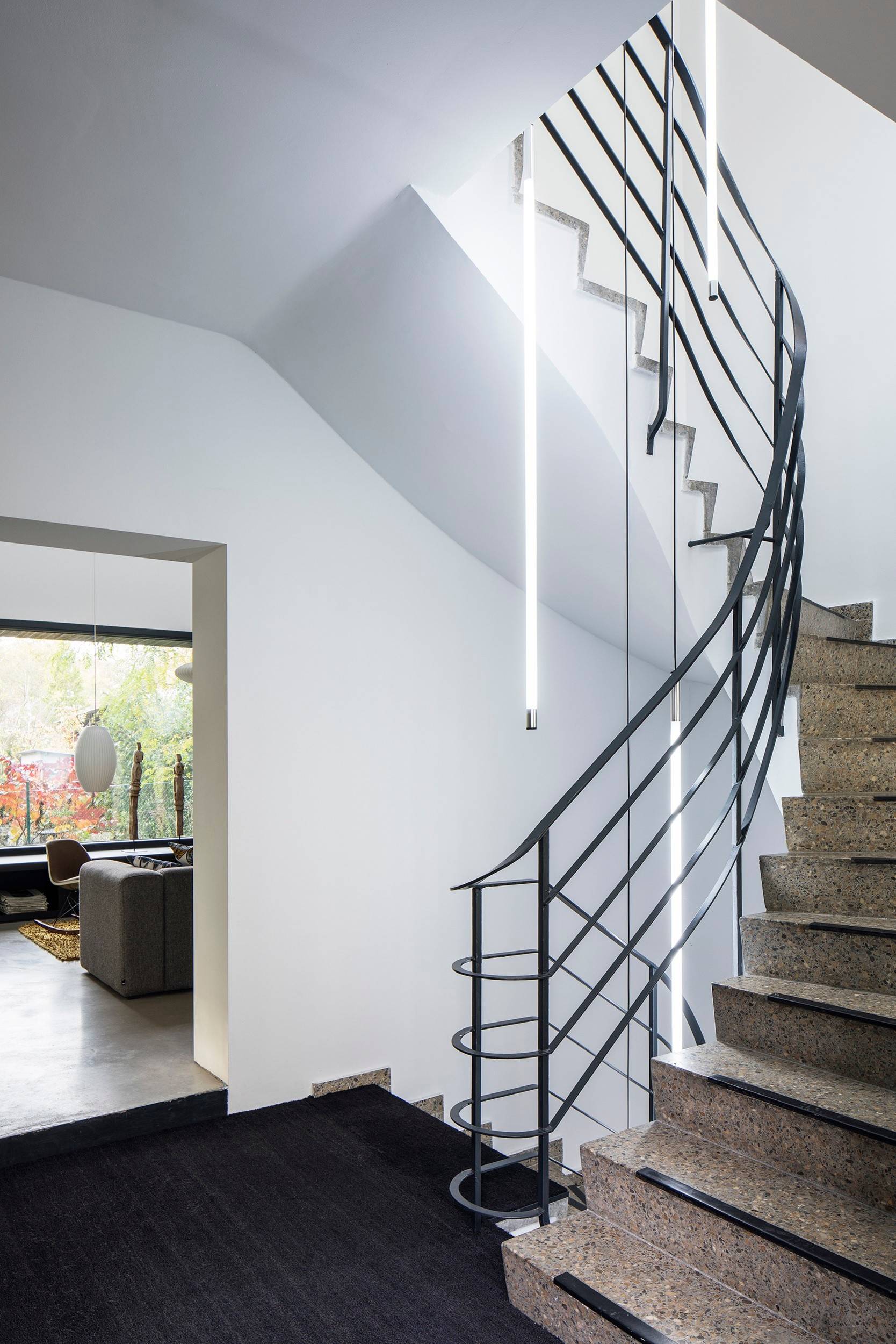 „Das sind einfache Industrieleuchten, die wir auch bei uns im Büro haben. Nicht jedermanns Sache. In diesem Fall gefiel dem Bauherrn allerdings unser Vorschlag, sie für die Beleuchtung des Treppenhauses einzusetzen“, erzählt Egger.