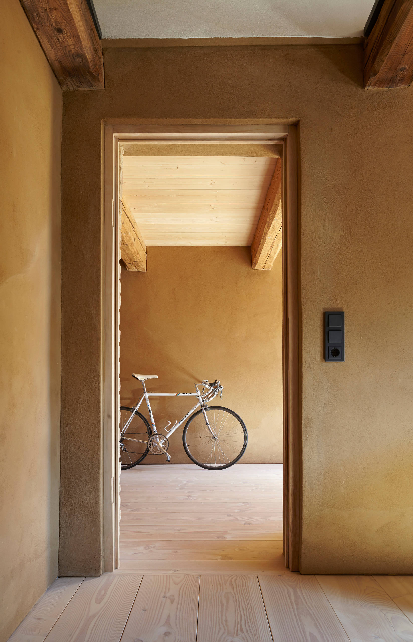 Auf die Wände im Bauernhof ist Lehmputz aufgetragen worden, der Anstrich ist rau, matt und wohngesund.