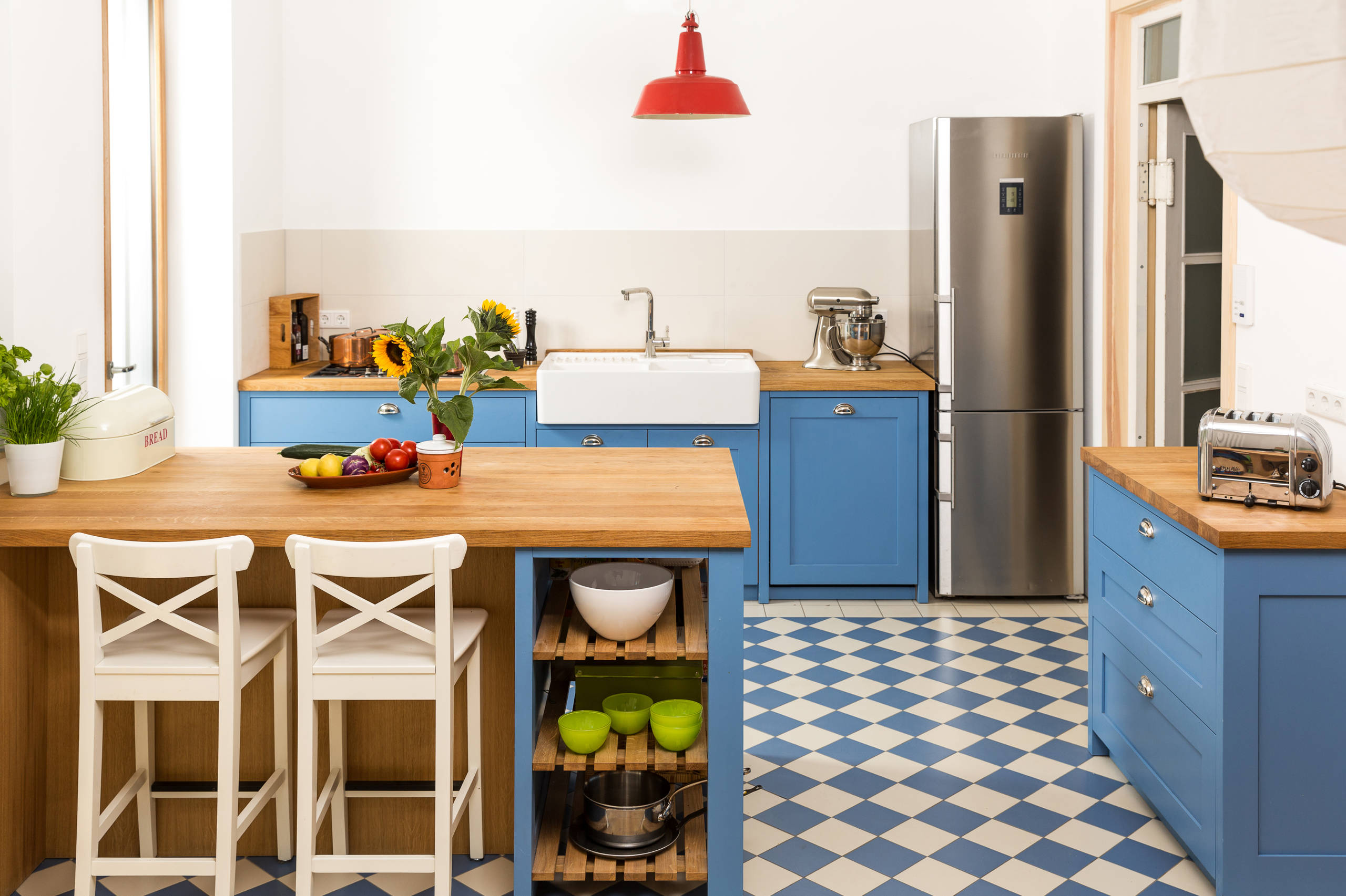 Die neue Küche der fünfköpfigen Familie sollte zu den schon ausgesuchten blauen und weißen Zementfliesen passen und für die Kinder einen Platz fürs Frühstück und die Schulaufgaben bieten. Philipp Welter und sein Team von Welter & Welter wurden mit der Raumgestaltung beauftragt – und bekamen weitgehend freie Hand. Eine gute Entscheidung, denn die strahlend blaue Landhausküche mit der Holzarbeitsplatte passt nicht nur hervorragend zum blau-weißen Schachbrettmuster des Bodens, sondern auch zu den jetzt sehr zufriedenen Besitzern.