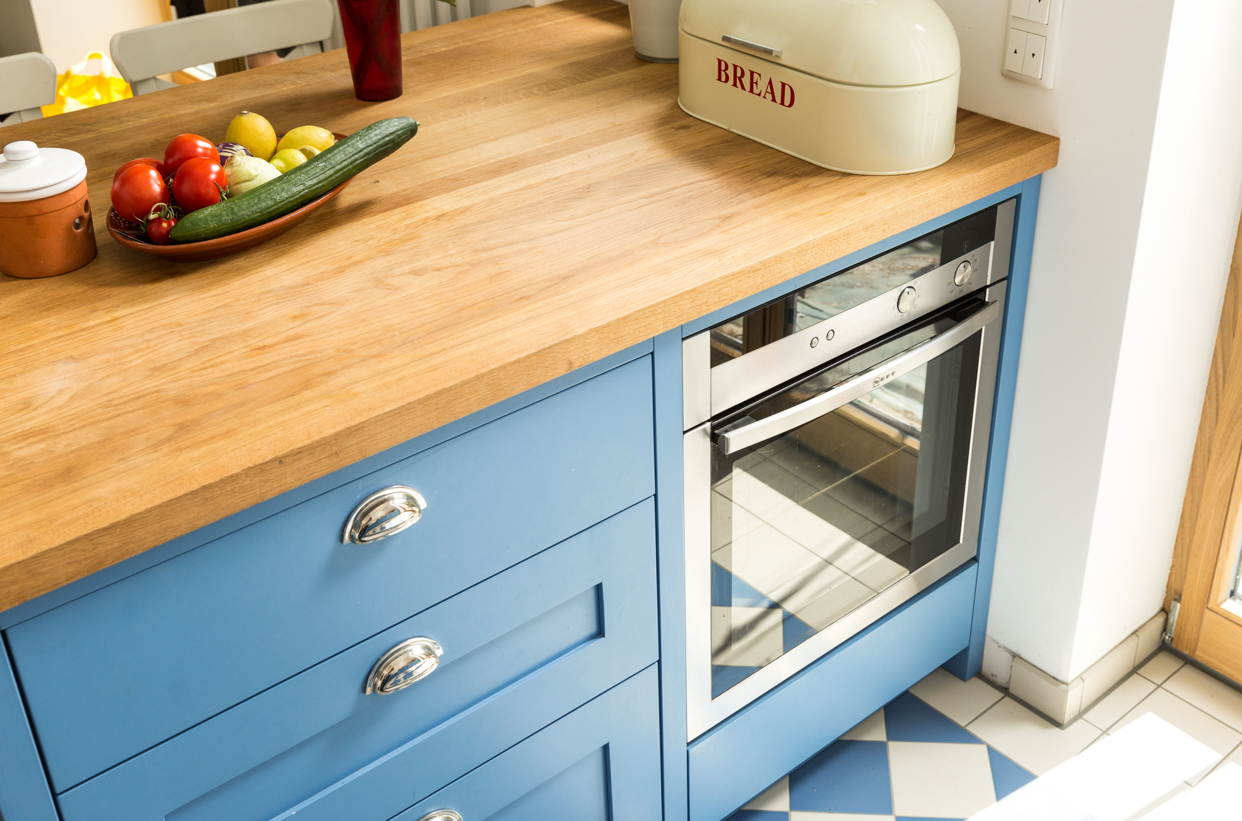 Die Arbeitsplatte aus massiver Eiche sorgt in der blauen Küche für eine warme Atmosphäre und ergänzt optisch die langen Eichendielen, die im übrigen Haus verlegt wurden.