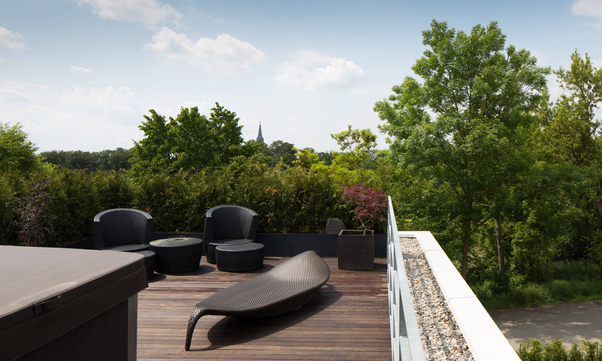Und ein Stockwerk weiter oben befindet sich der Rückzugsort der Eltern – von hier hat man die beste Aussicht. „Die Dachterrasse mit Bambus und Jacuzzi gibt den herrlichen Blick auf das Ulmer Münster frei“, sagt Philipp.