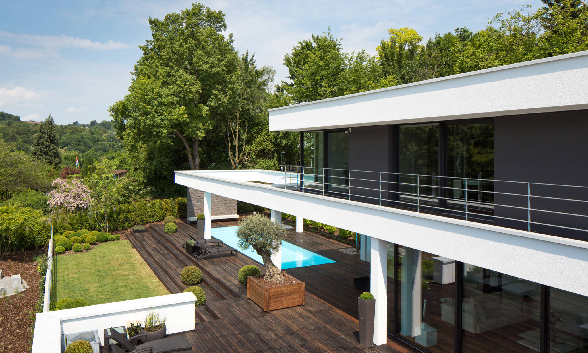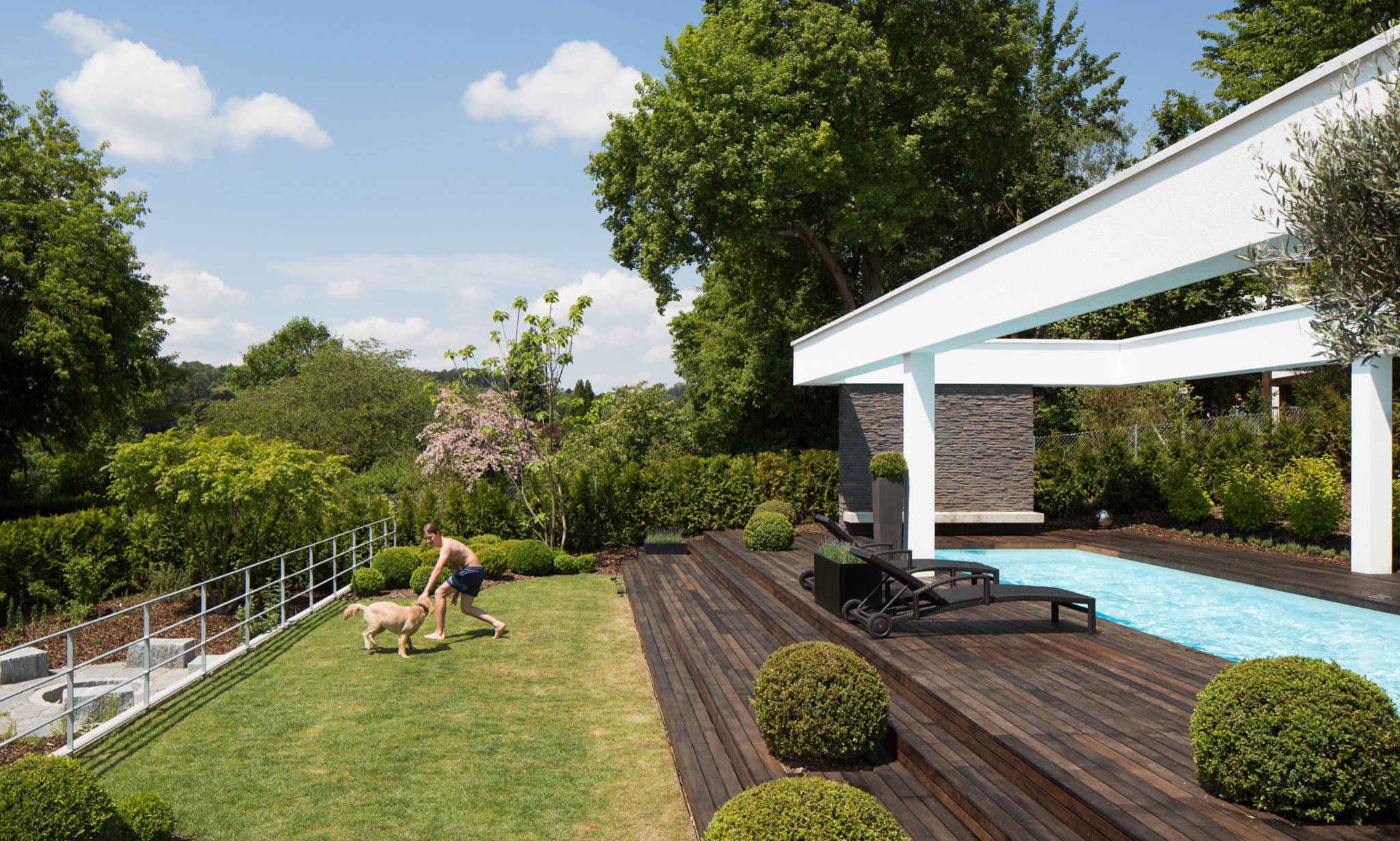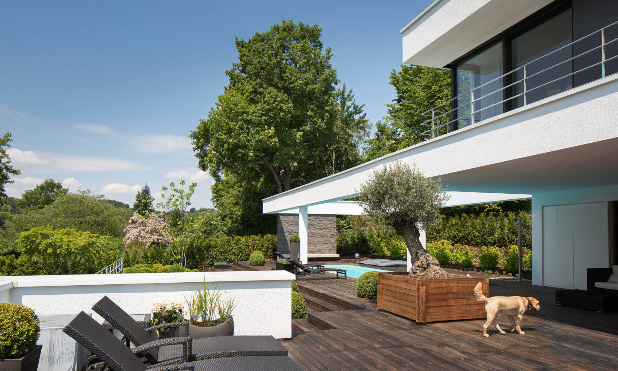 Die Bepflanzung des Gartens sollte vor allem pflegeleicht sein, da die Bauherren beide berufstätig sind. „Farblich spielt sich alles in grünen und weißen Tönen ab“, sagt die Architektin. Dazu kamen vor allem Buchsbaumhecken und Olivenbäume zum Einsatz. „Die große Rasenfläche war der Familie wichtig, damit auch der Hund Platz zum Tollen hat.“