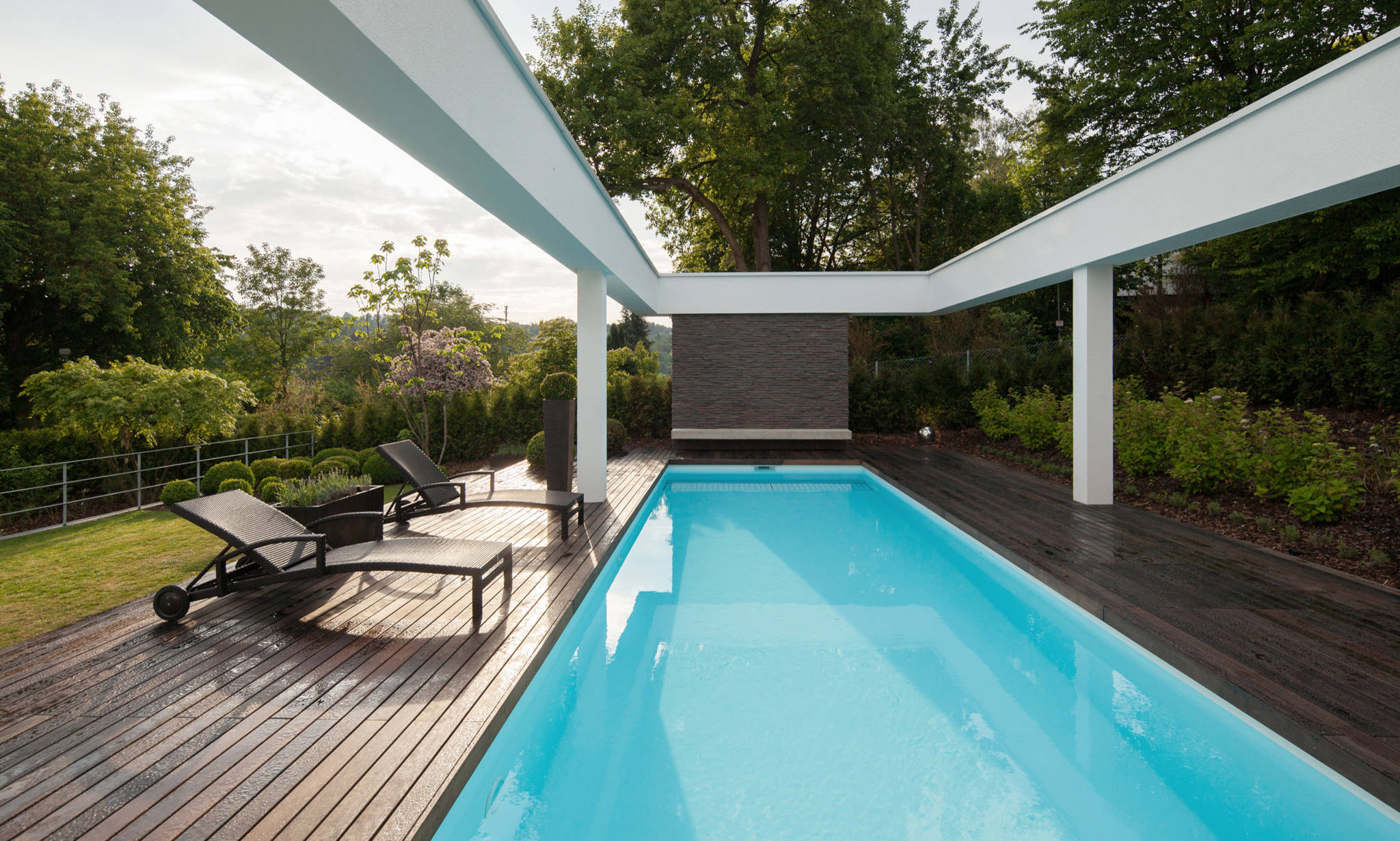Das Pooldeck und die Terrassen sind mit Bankirai belegt. „Die Familie hatte gerade erst ihren Garten und die Terrasse in München neu gestaltet, als aus beruflichen Gründen ein Umzug nötig war. Das Bankirai, dass sie dort verlegen ließen, haben wir mitgenommen und nun hier wieder eingesetzt“, sagt Anna Philipp.