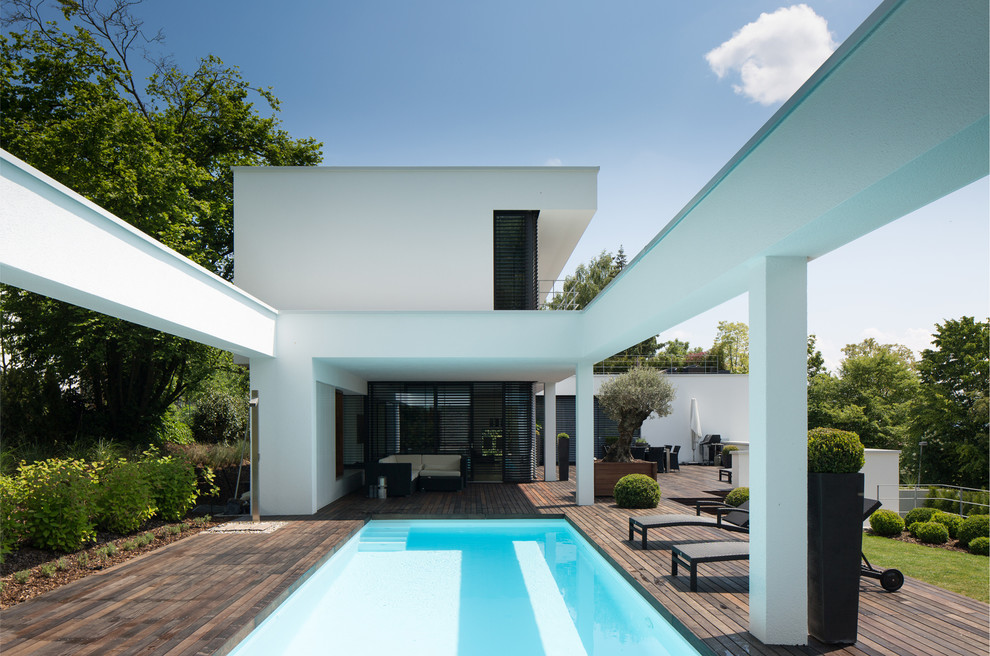 Tauchen Sie mit uns ab – in diesen türkisfarbenen Pool einer jungen Familie in Ulm! Das elf Meter lange Becken beeindruckt nicht nur durch seine konsequent architektonische Gestaltung. Neben der herrlichen Aussicht über einen kleinen Stadtwald bis hin zur 161,53m hohen Kirchturmspitze des weltbekannten Ulmer Münster, bietet die großzügige Terrasse durch verschiedene Zonen Platz für geschützte Ruhebereiche, Sonnenliegen und Freisitze.